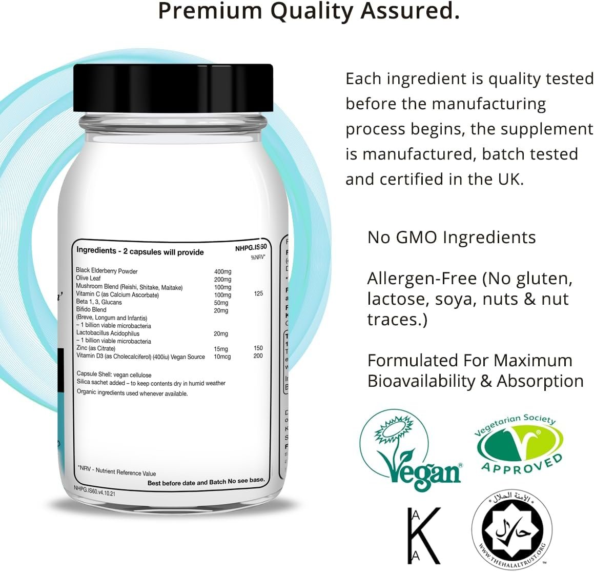 This unique botanical formulation is for those people who want to maintain healthy immune function and is a special combination of carefully chosen botanicals and nutrients. Immune Support contains a useful combination for promoting good immune function. It provides good amounts of black elderberry, olive leaf, zinc, beta 1,3, glucans, vitamin D3, mushrooms, vitamin C and probiotics. All in just two capsules a day to help support healthy immune function. Ingredients are organic where possible. No excipients (such as fillers, anti-caking agents, preservatives) in the capsules just the key nutrients you need. This product is Kosher and approved by the Vegetarian Society.