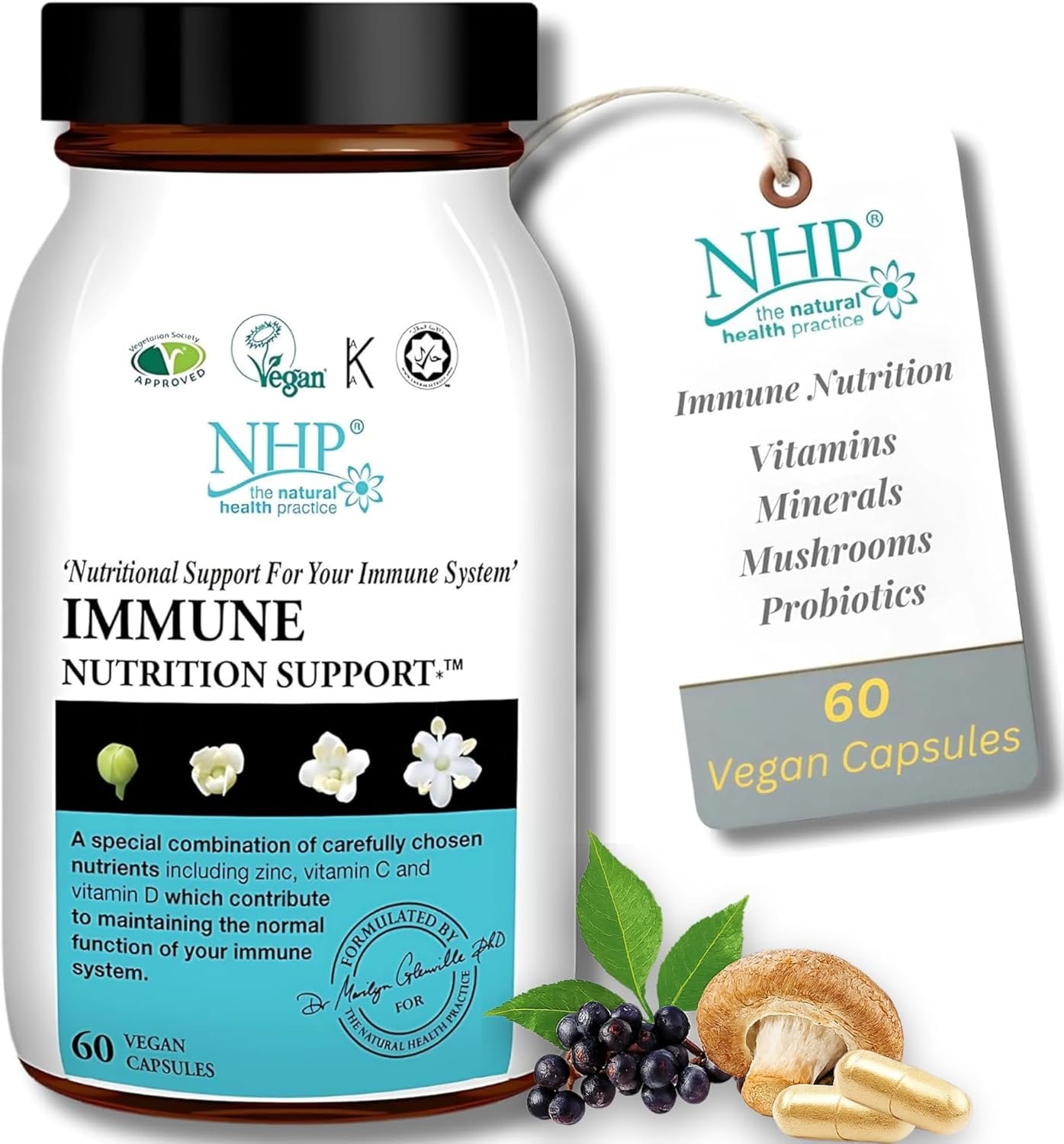 NHP Immune Support Supplement 60 Capsules – Vegan Formula with Elderberry, Mushroom Complex, Probiotics, Vitamin D3 & Zinc – Daily Immune Booster for Natural Defense & Gut Health