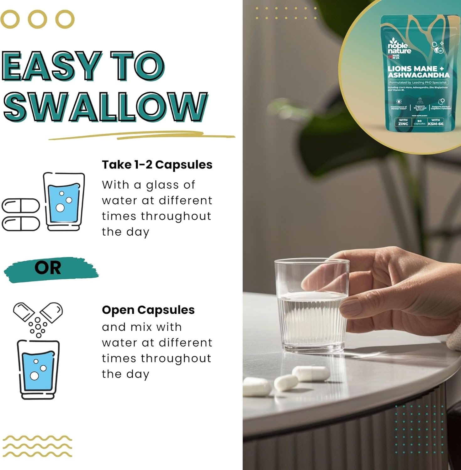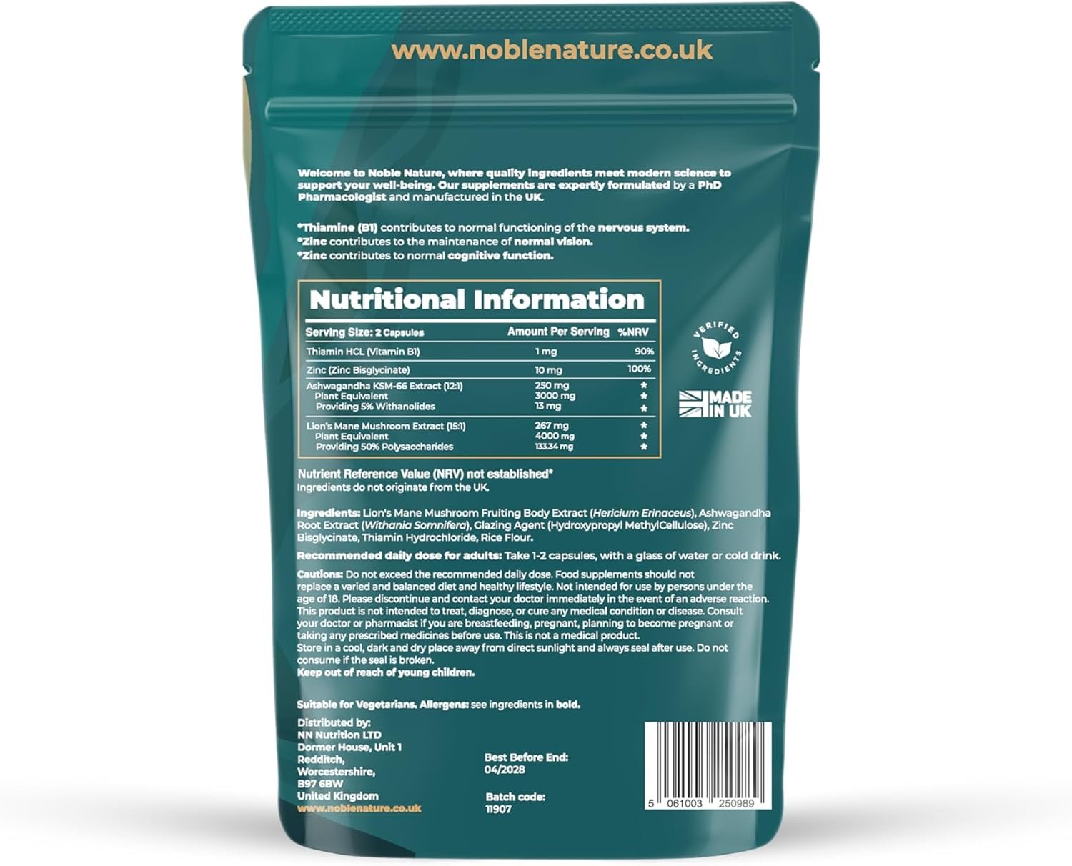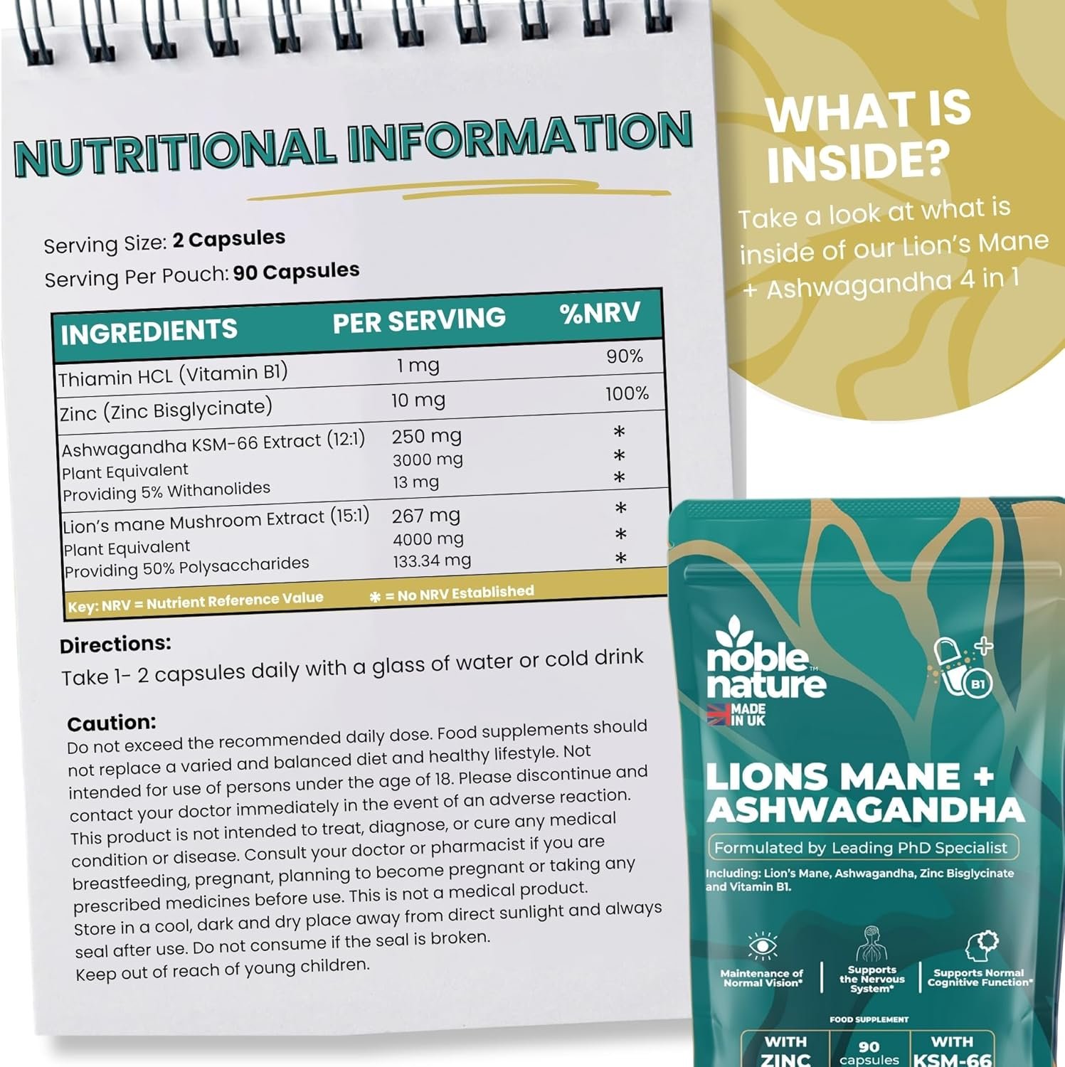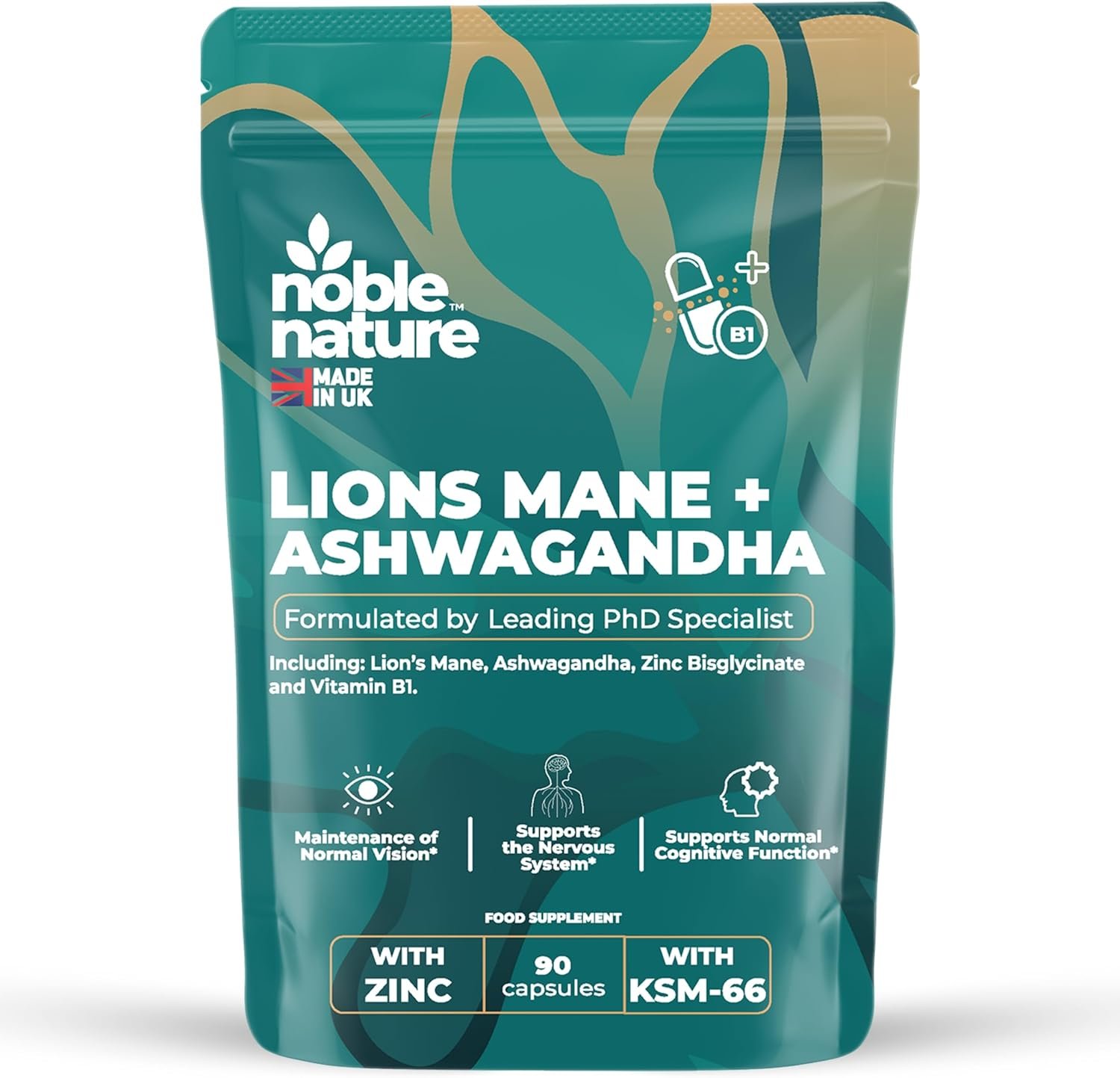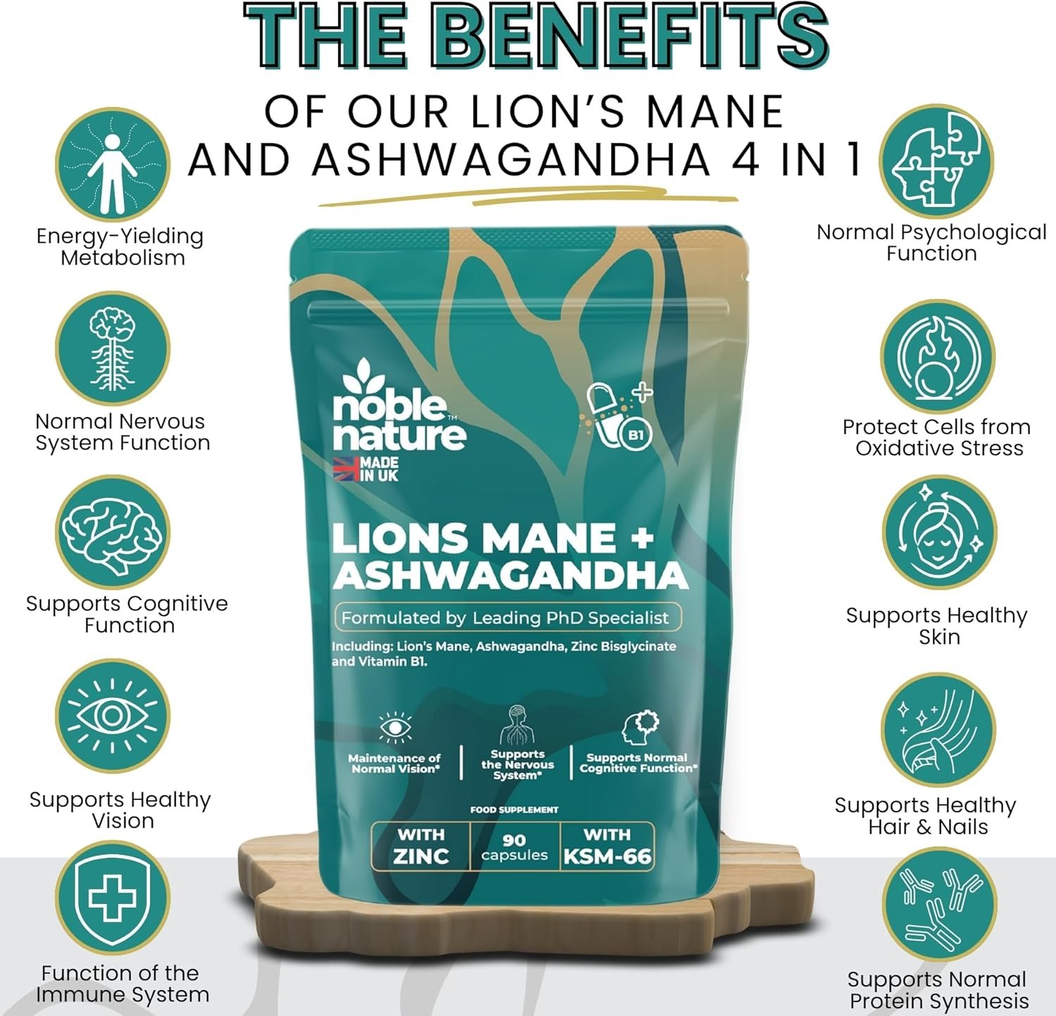 Noble Nature Lion’s Mane & Ashwagandha KSM-66 4-in-1 Adaptogen & Nootropic Supplement with Zinc Bisglycinate & Vitamin B1 – Brain, Focus & Calm Support – Made in The UK – 90 Capsules