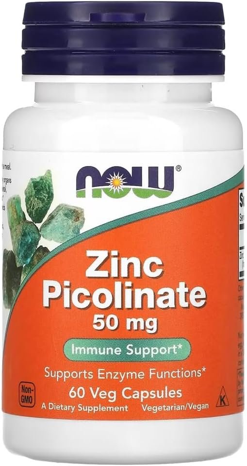 NOW Foods Zinc Picolinate provides 50mg of highly bioavailable zinc to support immune function and promote skin health. Zinc is an essential mineral that plays a crucial role in enzyme function, immune defense, and wound healing. The 60 veg capsules offer an easily absorbed form of zinc for daily immune and skin health support.