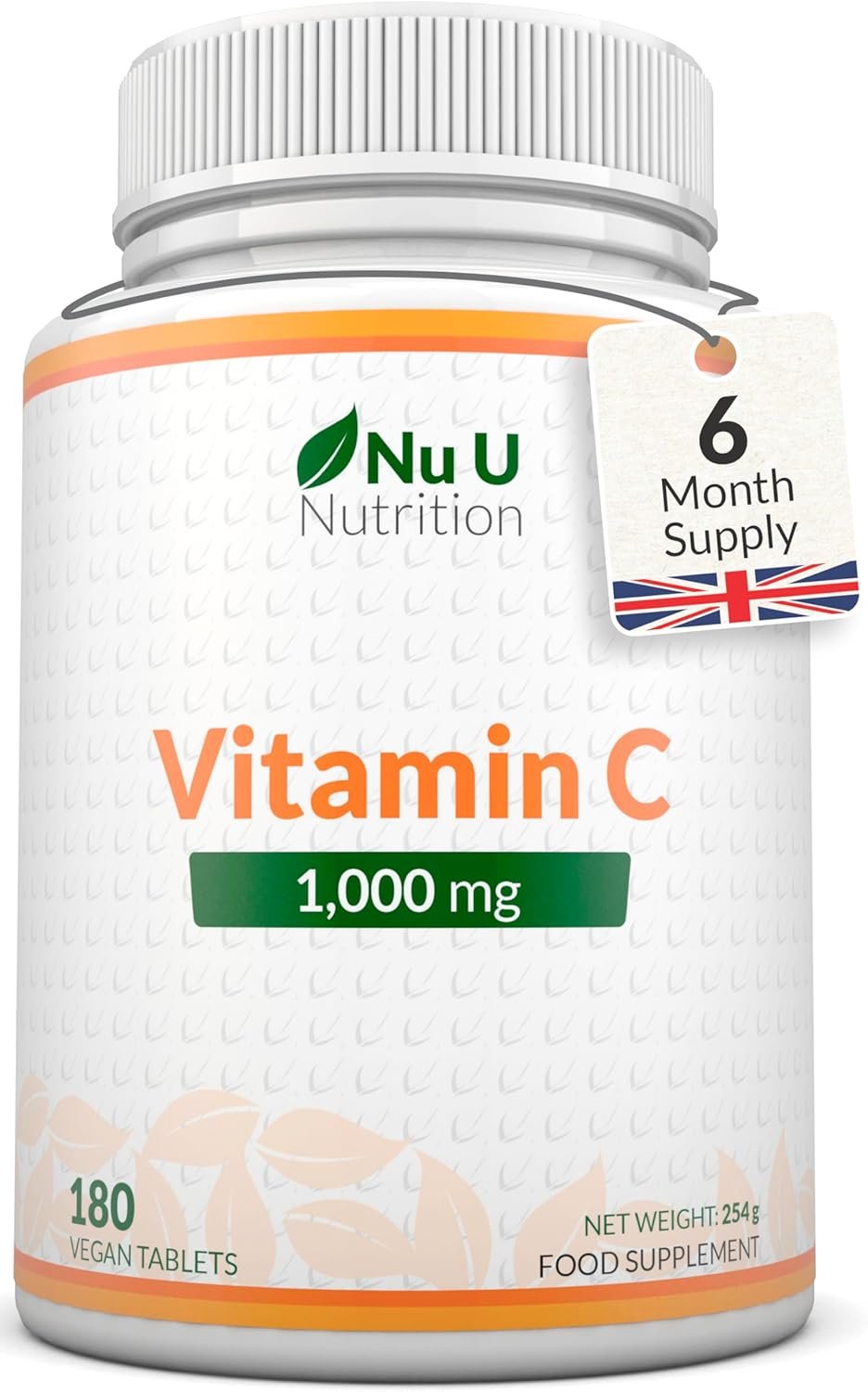 Nu U Nutrition – Vitamin C 1000mg – 180 Vegan Tablets – 6 Month Supply – High Strength Ascorbic Acid – Supports Immune System, Energy & Collagen Formation* (EFSA) – Made in The UK