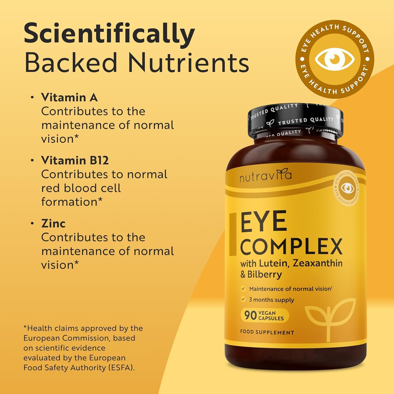 ✔︎ NUTRIENTS FOR MAINTENANCE OF NORMAL VISION – Our Eye Complex includes nutrients vital for eye health such as Vitamin A and Zinc which both contribute to the maintenance of normal vision; Zinc for normal metabolism of vitamin A; and Vitamin B12 which contributes to red blood cell formation and normal functioning of the nervous system including the optic nerves. All claims are substantiated by EFSA.
