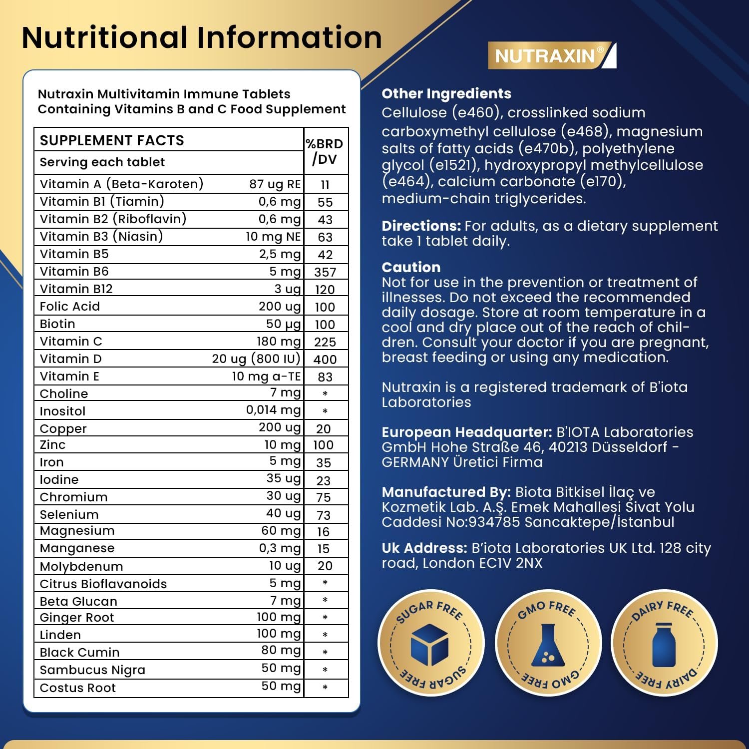 Nutraxin Multivitamin and Minerals Immune Tablets – 14 Vitamins, 9 Minerals with Elderberry, Black Cumin & Beta Glucan for Immunity, Energy & Wellness – 60 Vegan, Multivitamin Tablets for Women & Men