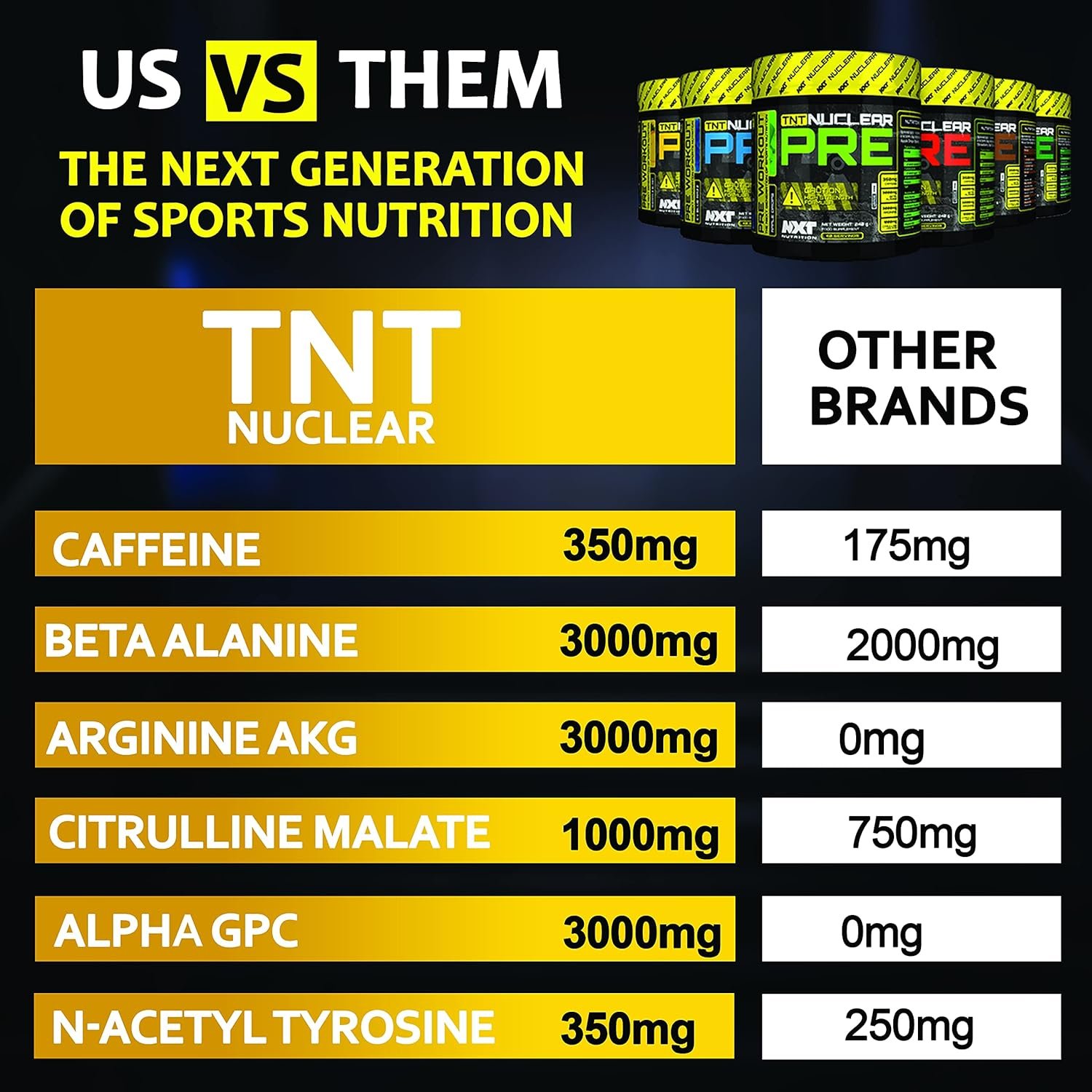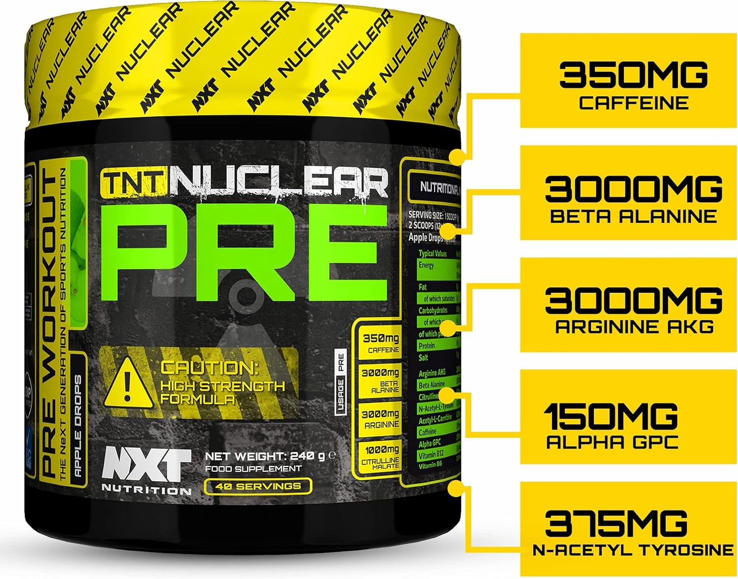 ★ EXCELLENT VALUE FOR MONEY – 40 servings TNT Nuclear Pre contains a No-holds-barred combination of Caffeine, B Vitamins, Beta Alanine, Arginine AKG, L- Citrulline, Alpha GPC, N Acetyl L- Tyrosine and L- Carnitine, guaranteed next level Pre Work Out
