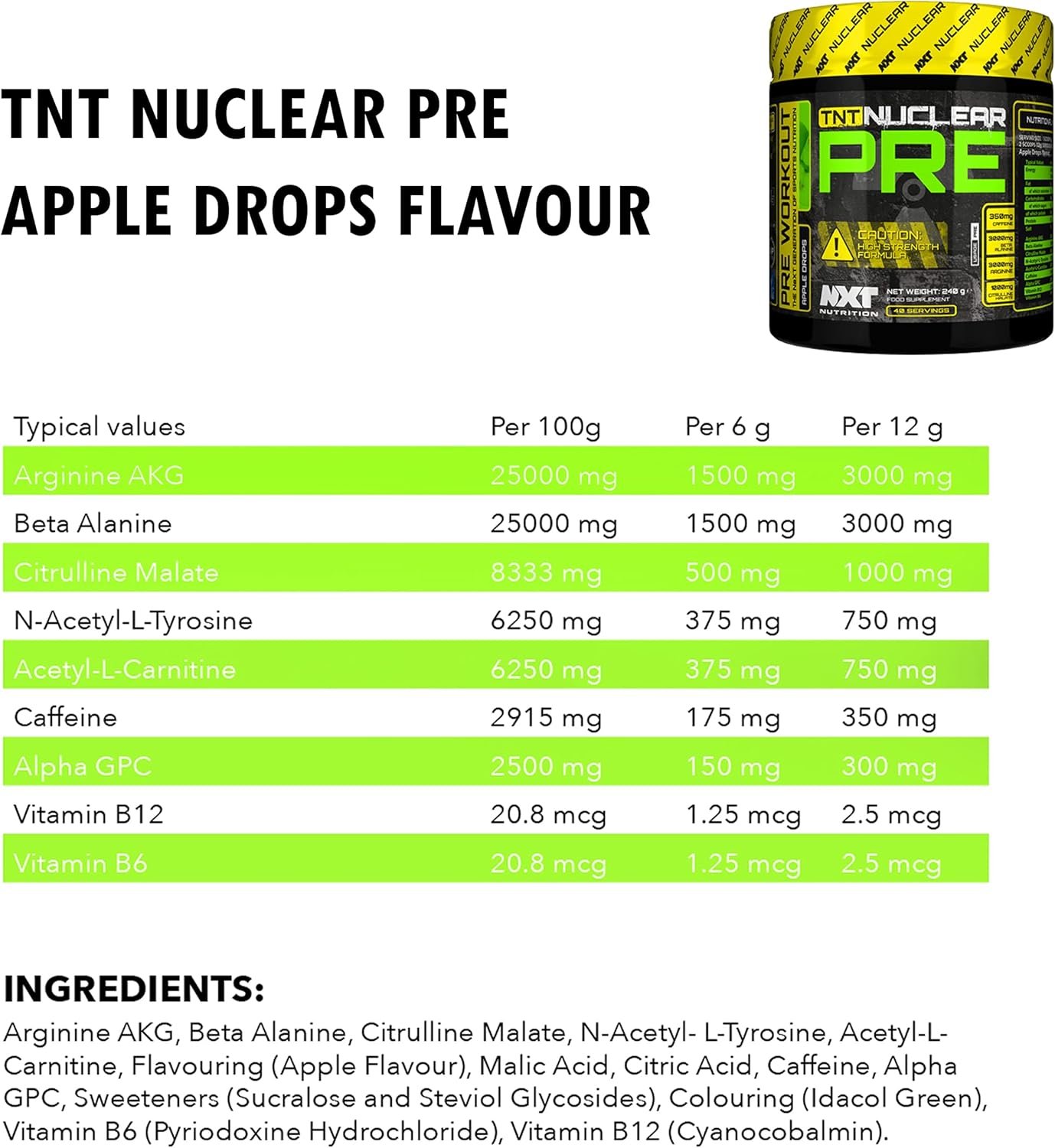 NXT Nutrition TNT Nuclear PRE Workout – 4 in 1 Energy Drink with Citrulline, Beta Alanine, Arginine AKG, Vitamin B, Caffeine for Insane Energy, Muscle Pump, Endurance and Focus – 240 Gram, Apple