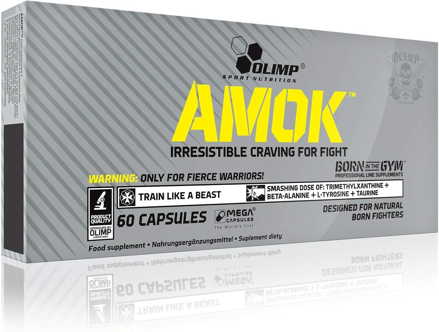 It’s a true killer; it has been developed to give you extremely high motivation and resistance, which is expressed through wild fury and a burning wave of energy thundering through your body after you take it and throughout the whole workout. AMOK is a unique mixture of precisely selected amounts of beta-alanine, L-tyrosine and taurine, supplemented with a portion of 1,3,7-trimethylxantine and ginseng to “tear you apart”. The amazing composition of ingredients in AMOK has also been supplemented with a well-thought-out mixture of vitamins and minerals which condition the stability of energetic processes taking place in your body during extreme physical strain.