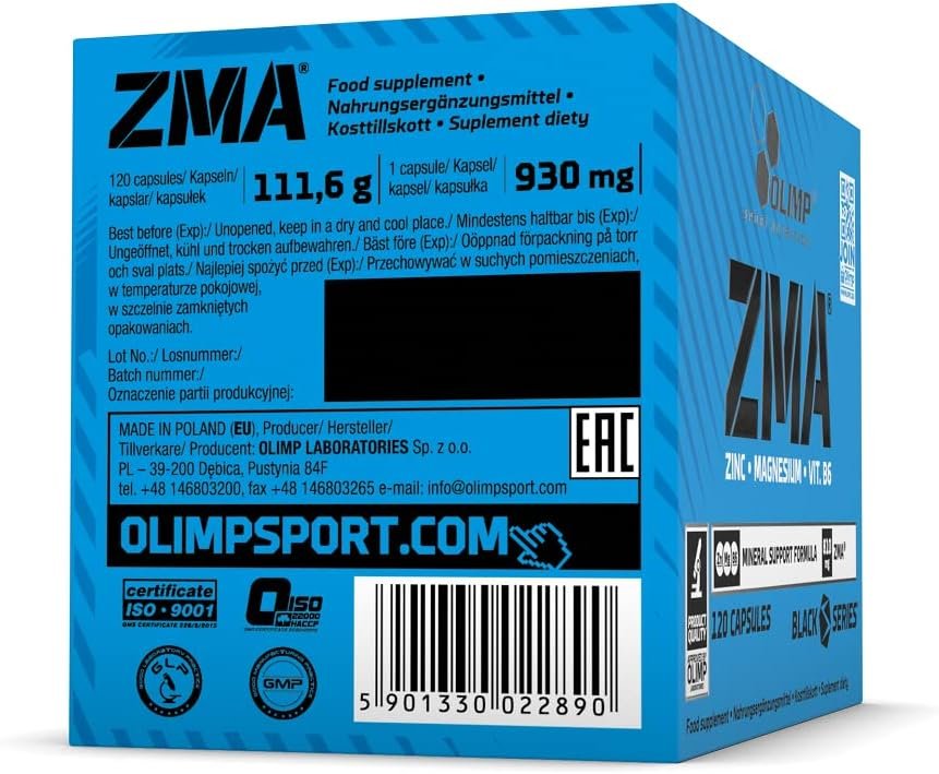 OLIMP ZMA is a product containing a unique system of elements – zinc and magnesium – chelated with amino acids, and vitamin B6. It is a natural non-steroid anabolic and antioxidant formula. Individual substances contained in the product are essential for everyday protection of the body against adverse effects of overtaxing, related to intense physical exercise, the lack of appetite, traumas, and so-called oxidative stress. OLIMP ZMA contributes to the increase of the level and activity of testosterone and increases the level of IGF-I and leptin which are responsible for better use of energy and for enhancing the endurance and strength of the body. The product reduces protein catabolism, supports the building of muscle mass, prevents muscle cramps, and alleviates pain associated with overtraining. It counteracts the adverse effects of overtraining, supports regeneration of the body, and prevents the occurrence of oxidative stress. Moreover, it improves concentration and contributes to deep relaxing sleep.