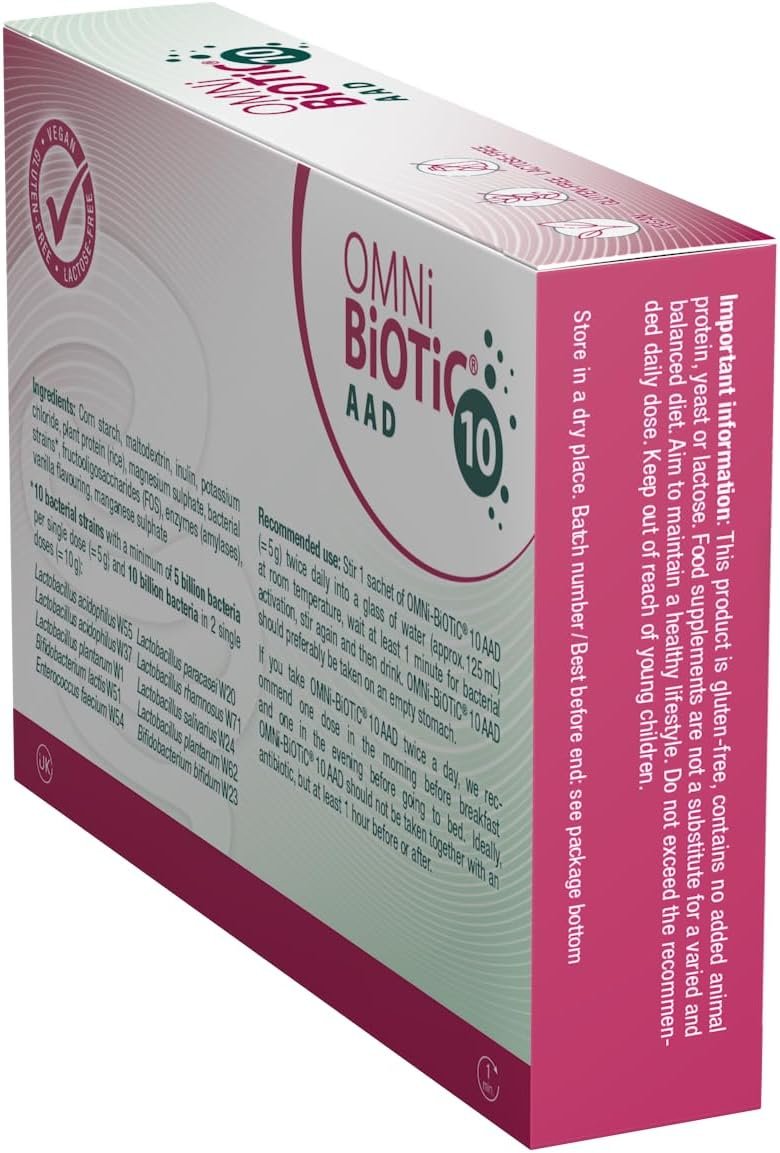 Use: During the whole period of antibiotic therapy, stir 1 sachet of OMNi BiOTiC 10 AAD twice daily into a glass of water at room temperature, wait at least 1 minute for it to activate, stir again and then drink.