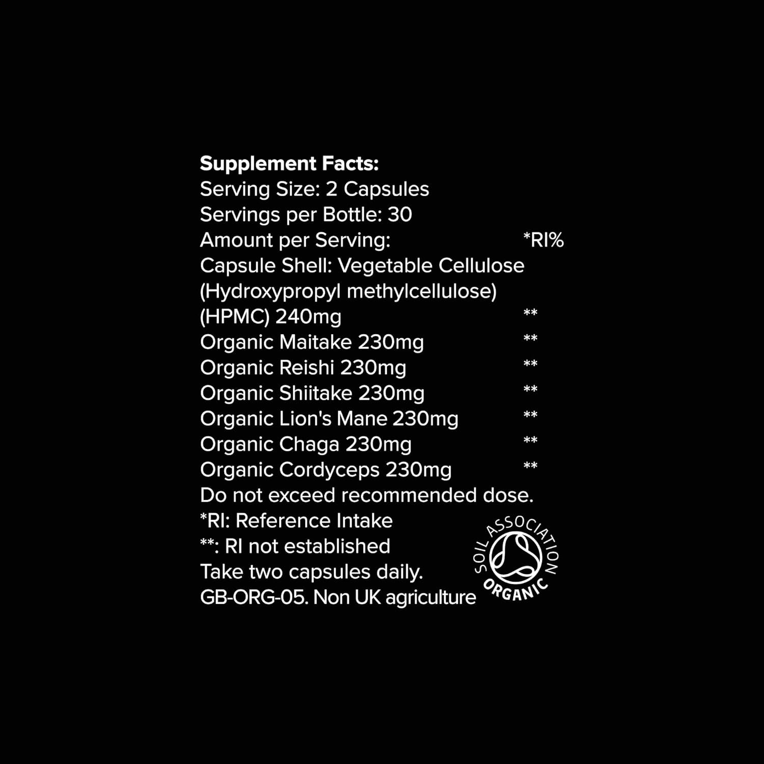 CERTIFIED ORGANIC, VEGAN & CLEAN | Soil Association Certified Organic and suitable for vegans. Our mushrooms are grown without synthetic pesticides or fertilisers. Non-GMO, gluten-free, dairy-free, and free from fillers or artificial preservatives. We use vegetable cellulose capsules (HPMC), making this a truly clean-label supplement you can trust daily.
