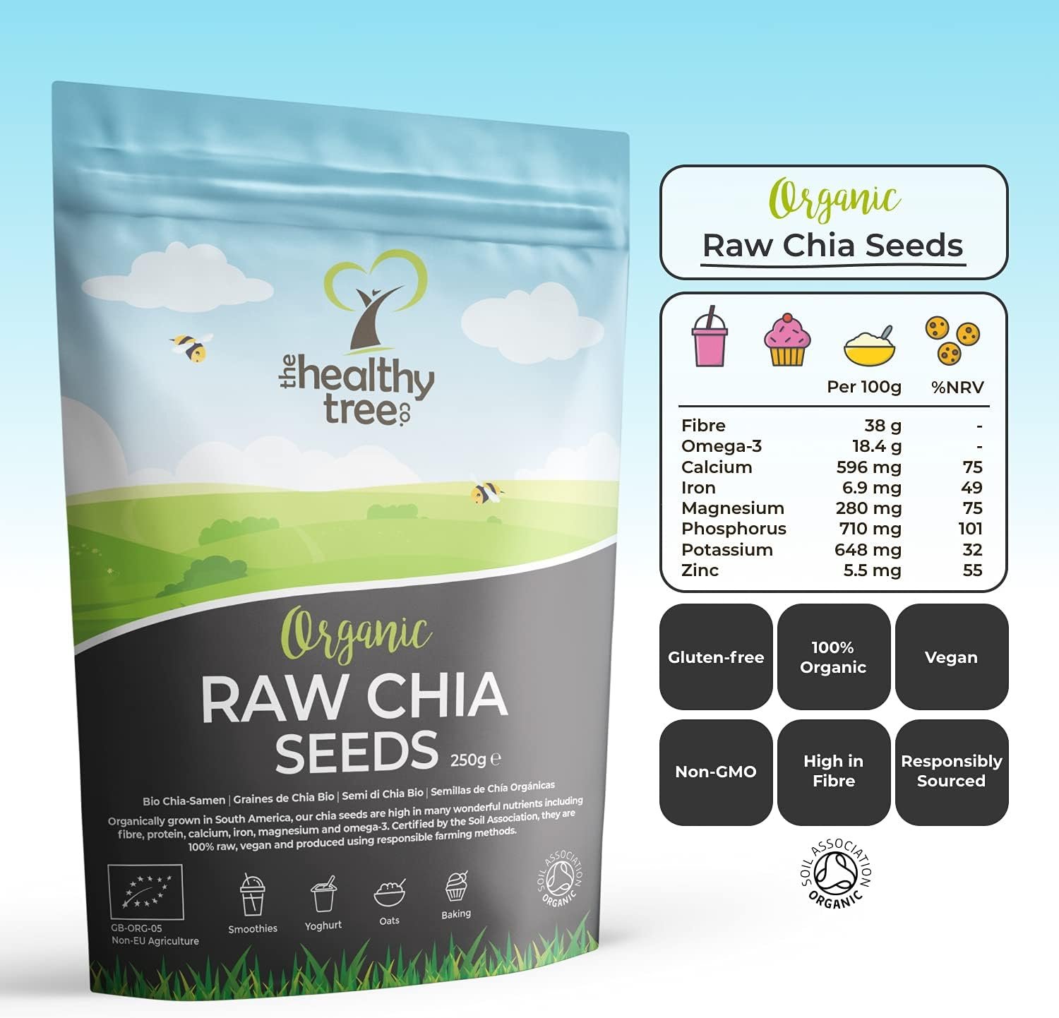 Certified Organic: Soil Association certified organic, vegan, and non-GMO, providing 100% pure chia seeds with nothing added or removed