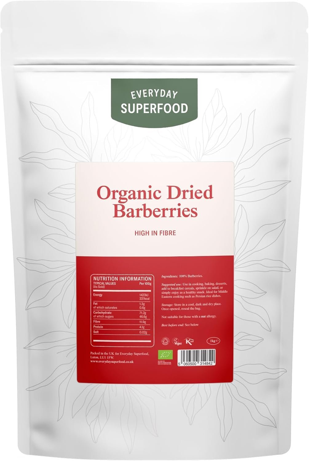 CERTIFIED: Unlike the commonly available conventional barberries, our Organic Dried Barberries are harvested from only a limited number of certified organic barberry farms that currently exist in the world. Our organic barberries are cleaned using the latest laser sorting equipments to maximise the detection and removal of defects often found in dried barberries. Everyday Superfood Organic Dried Barberries is certified organic by the UK Soil Association. Certified by the Vegan Society and KLBD.