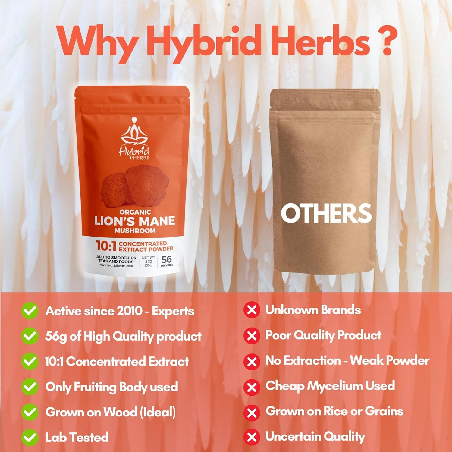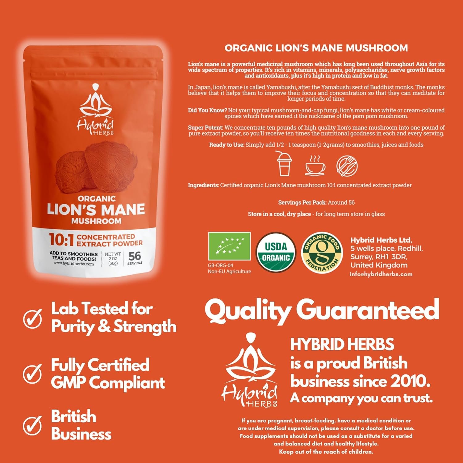 CERTIFIED ORGANIC AND ECONOMICAL: Hybrid Herbs’ Lion’s Mane is certified organic, vegan, and completely free from fillers, additives or preservatives. Each pouch offers up to 56 servings of clean, concentrated nutrition.
