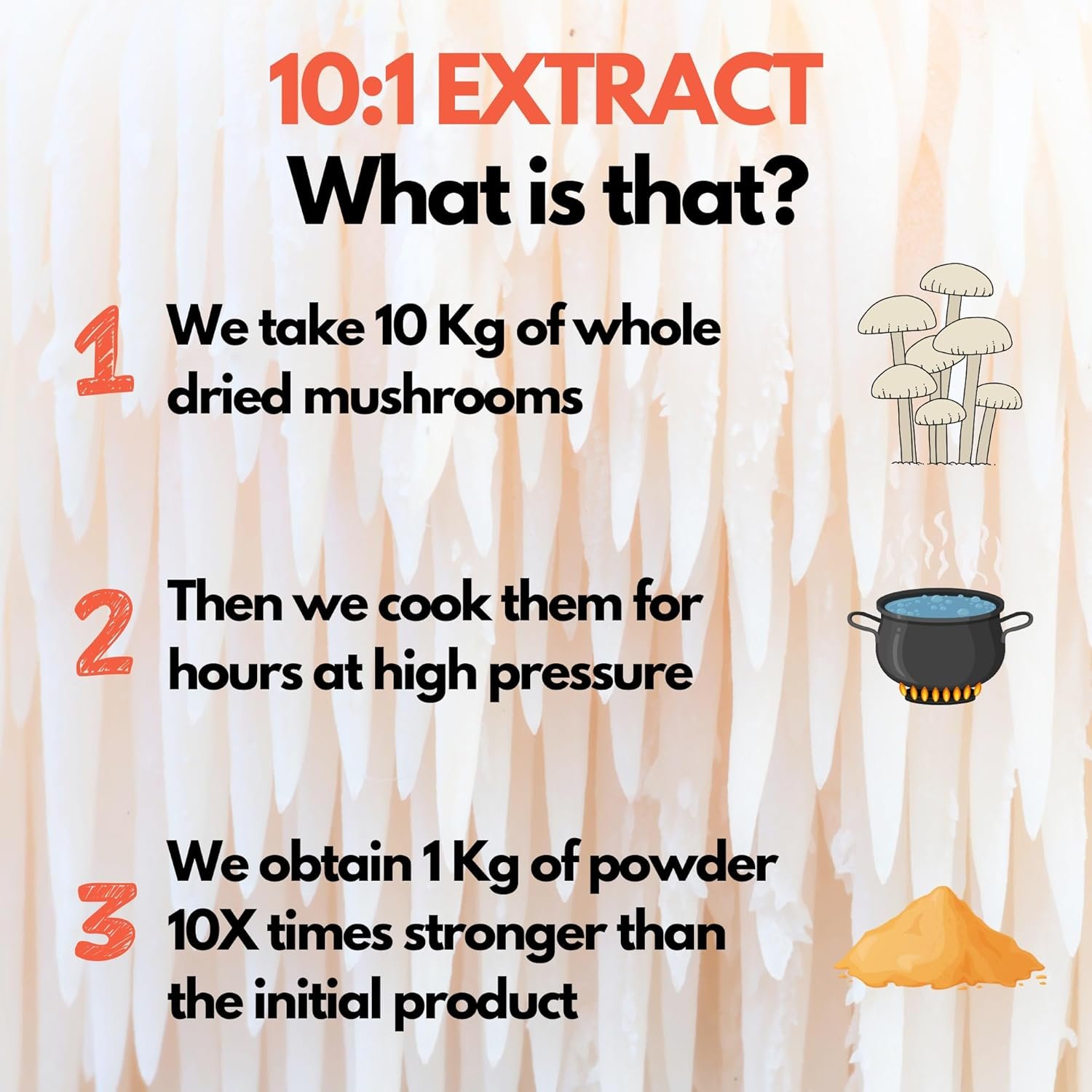 10:1 extraction means that we take 10 Kg of dried mushroom or plant, and after a slow cooking process at low temperature, we obtain 1 Kg of extract. This is why our products are so powerful!