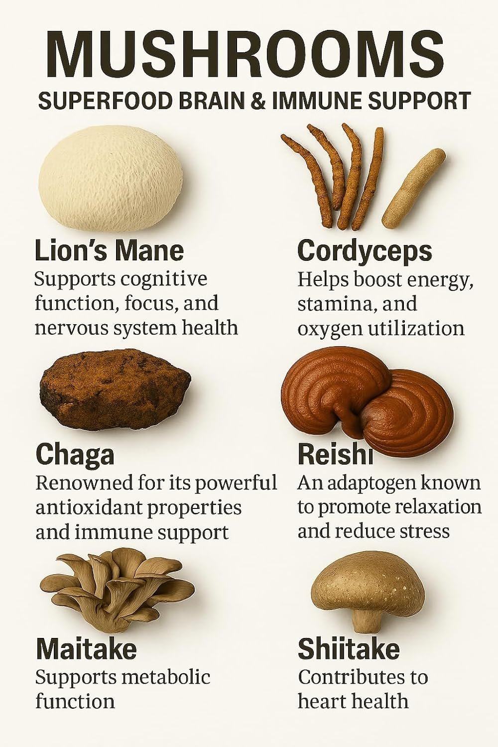 Shiitake A popular culinary and wellness mushroom, Shiitake offers natural compounds that may support heart and immune function.