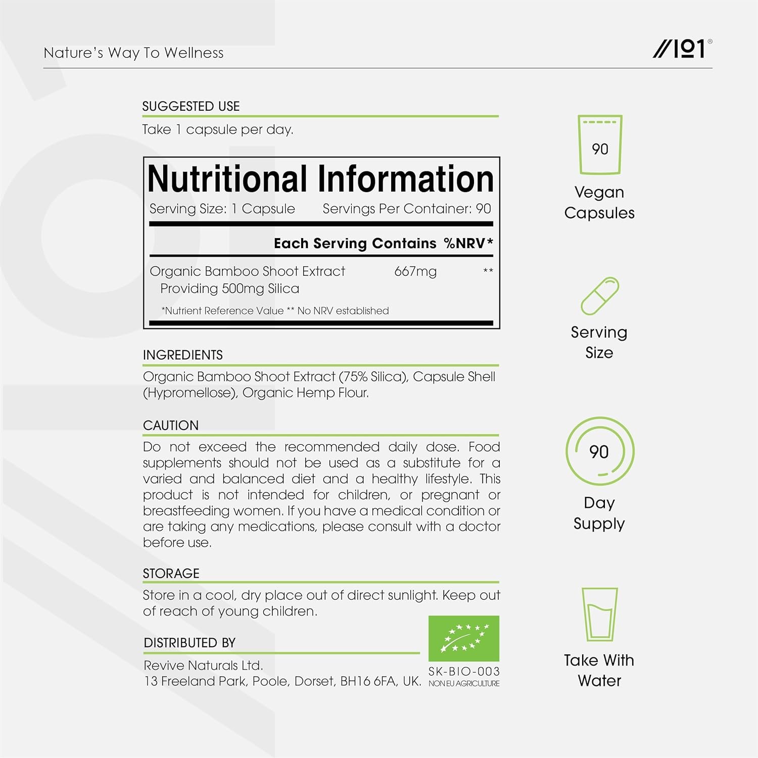 Organic Silicia 500mg – from Bamboo Shoot Extract – 90 Vegan Capsules (3 Months Supply) – Resealable and Recyclable Pouch – by Alpha01