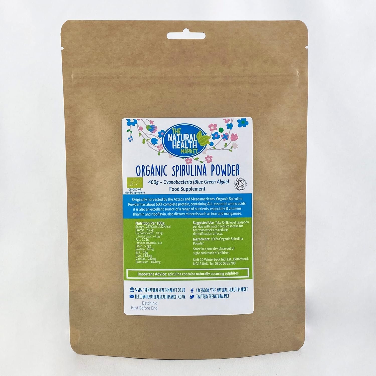 Our Organic Spirulina Powder is organic certified by the Soil Association and retains the vast majority of the nutrients. This spirulina powder contains no binders, fillers or preservatives.