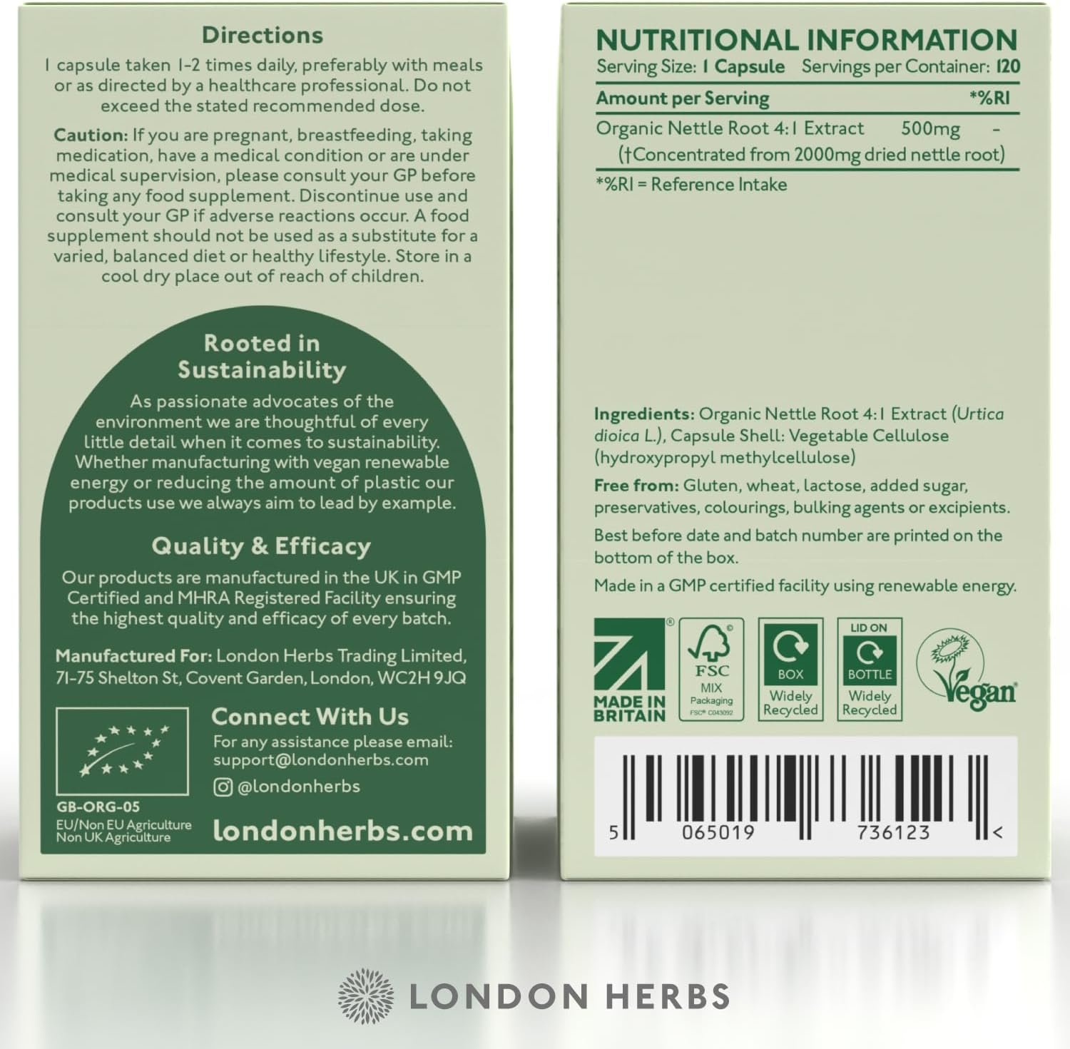 Caring for the Plant – Manufactured in the UK by London Herbs using 100% renewable energy that is Vegan Society certified. We pack our supplements using fully recyclable materials, FSC certified card and natural inks.
