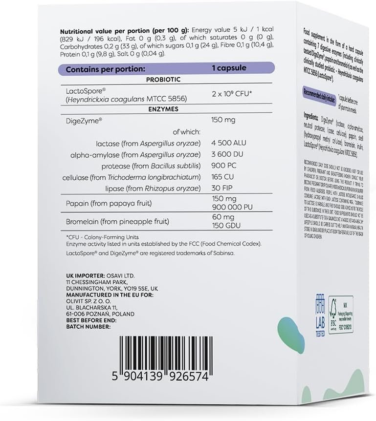Digestive enzymes + probiotic: formula combining clinically tested ingredients, with proteolytic enzymes: papain and bromelain, stable probiotic, containing Heyndrickxia coagulans spores.