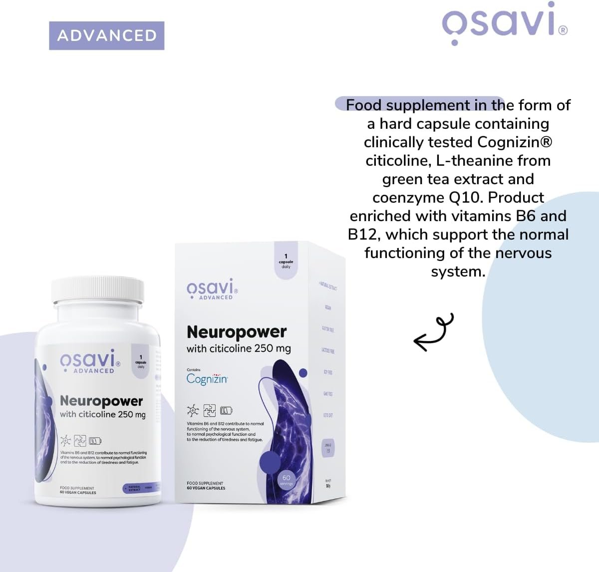 Osavi Neuropower with Citicoline 250 mg – 60 Vegan Capsules | Supports Nervous System & Psychological Health | Includes Cognizin® Citicoline, L–Theanine, Coenzyme Q10, B6 & B12 for Mental Clarity