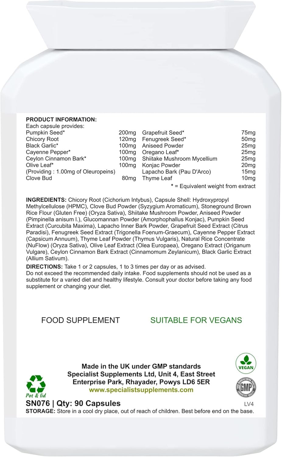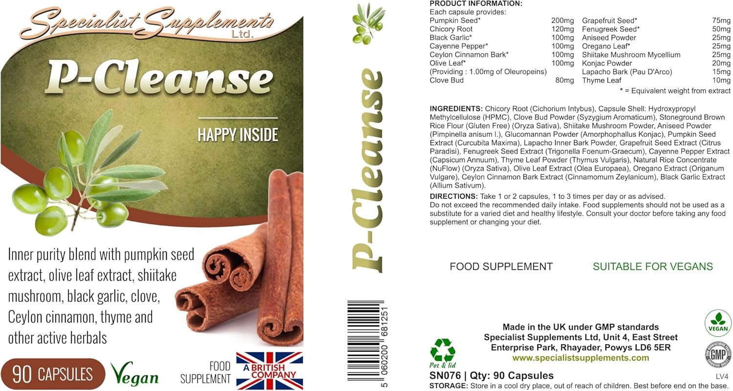 P-Cleanse is a herbal gastrointestinal care, cleanse and detoxification formula. It contains a range of tried and tested herbs and concentrated foods to support digestive tract health and, as such, is popular with naturopaths, colon hydrotherapists and herbalists during detox and cleansing programmes. A special blend of herbal ingredients: pumpkin seed, chicory root, black garlic, cayenne pepper, Ceylon cinnamon bark, olive leaf (providing 1.00mg of oleuropeins), clove bud, grapefruit seed, fenugreek seed, aniseed, oregano leaf, shiitake mushroom, konjac, Lapacho Bark (Pau D’Arco) and thyme leaf