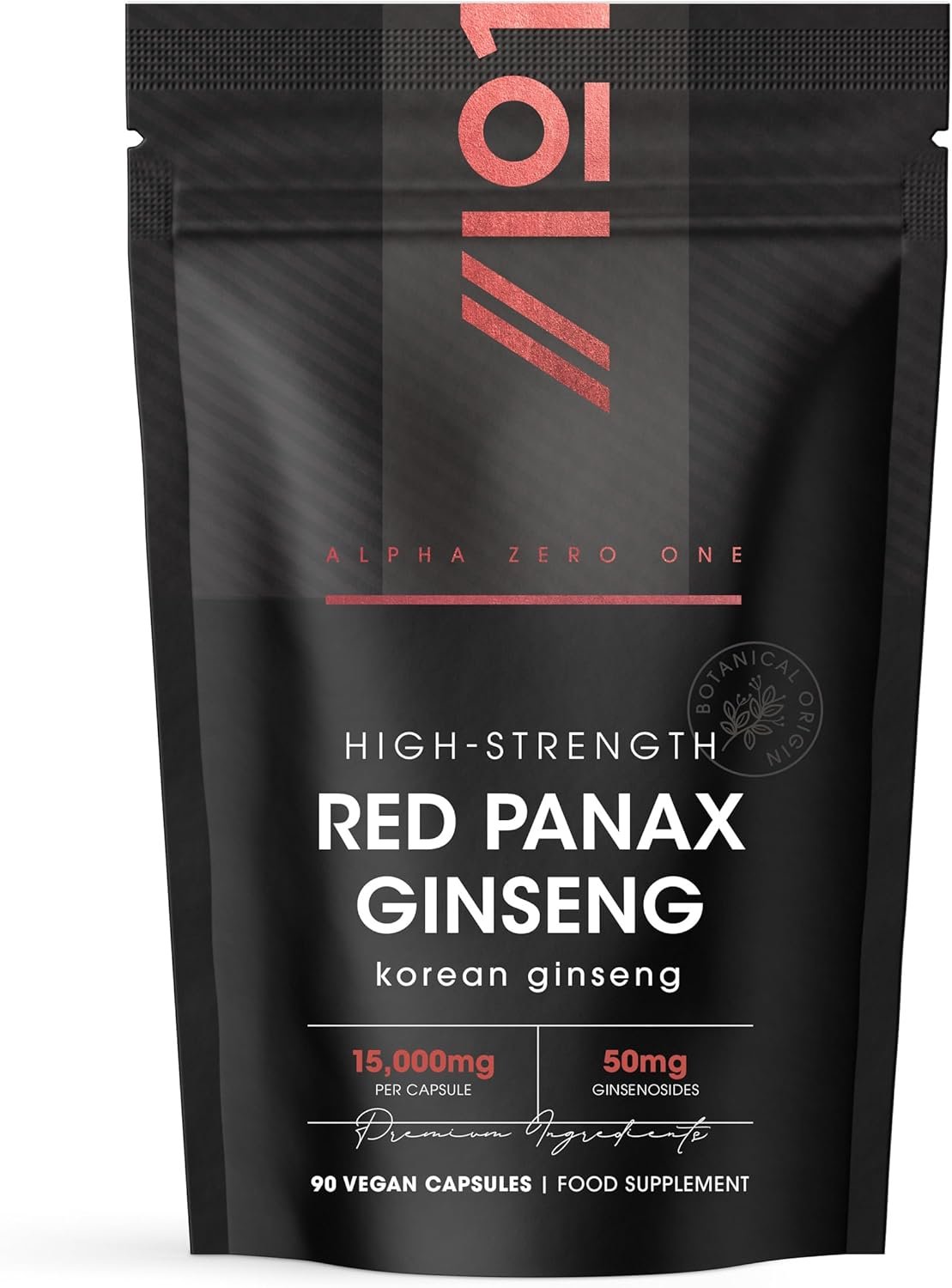 Panax Ginseng Extract 15,000mg – 50mg Ginsenoids High Strength Korean Red Ginseng – 90 Vegan Capsules – Resealable and Recyclable Pouch by Alpha01