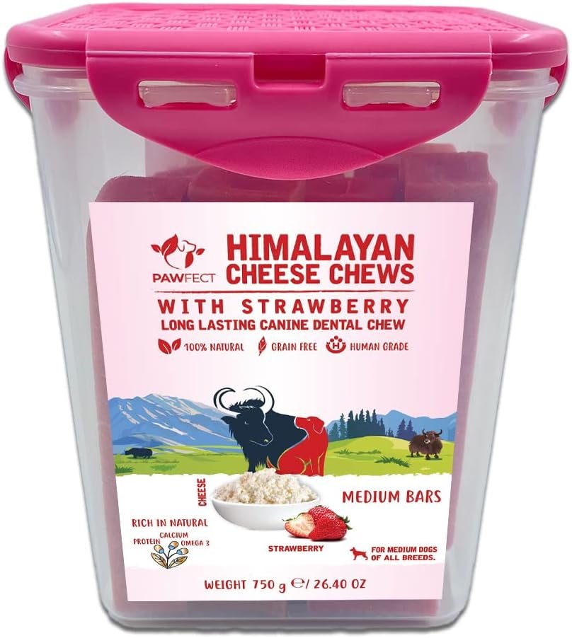 Pawfect Himalayan Cheese Chew Strawberry Bars (Medium, 10-Pack Tub, 750g/26.45oz) – Natural Dental Treats for Dogs – Grain-Free, Antioxidant-Rich Yak Milk Chews