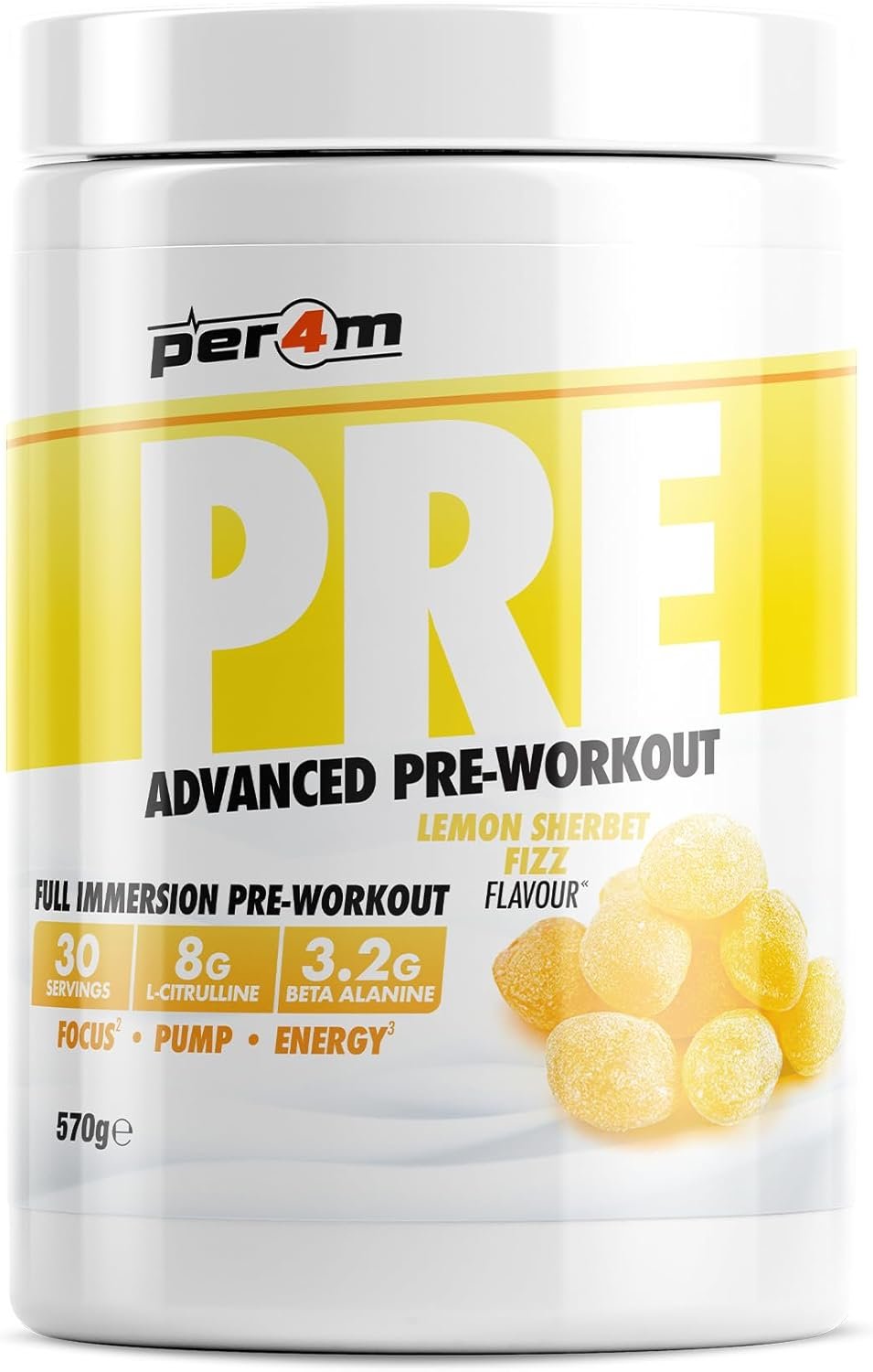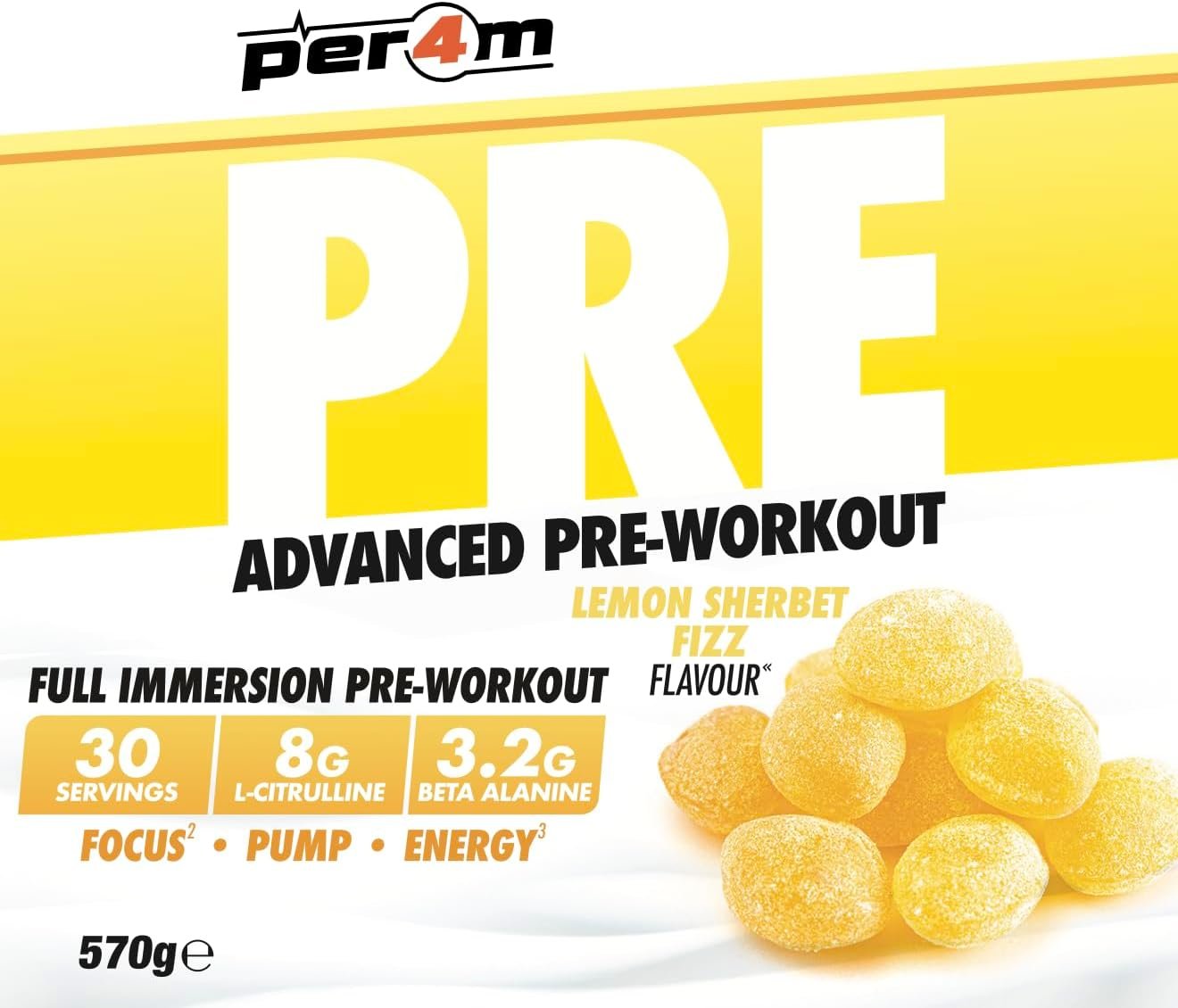 Per4m Pre Workout Powder | Intense Pump, Sustained Energy & Mental Focus | L-Citrulline, Beta Alanine & Caffeine & Added Hydration (570g, Lemon Sherbet Fizz)