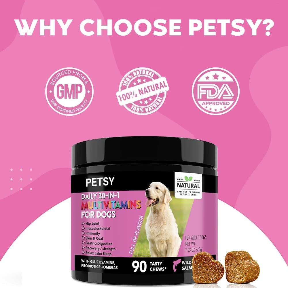 PETSY™ Dog Vitamins & Supplements 20-in-1 Essential Multivitamins, B2,B3,B6,B7,B12, Vit C, Folic Acid, Biotin, Glucosamine, Chondroitin, Wild Alaskan Salmon oil, Hemp Seed oil, Probiotics Blend Treats