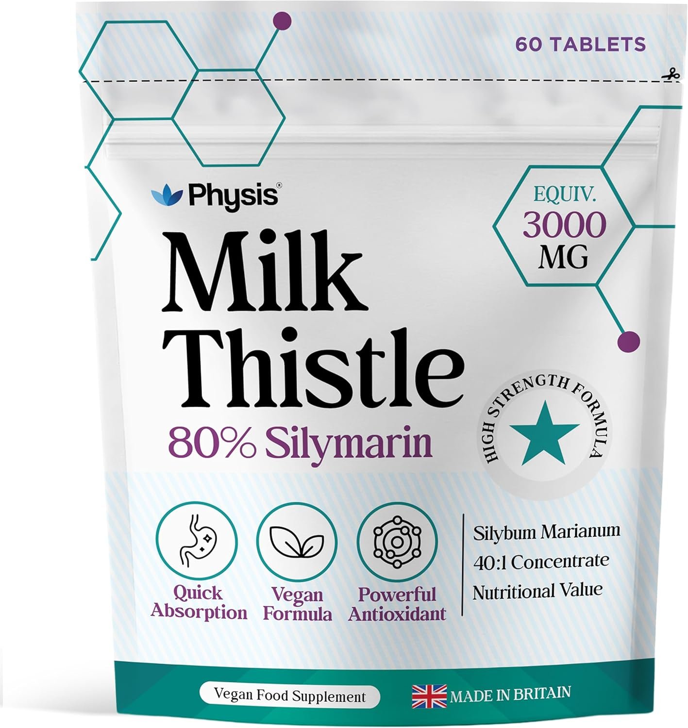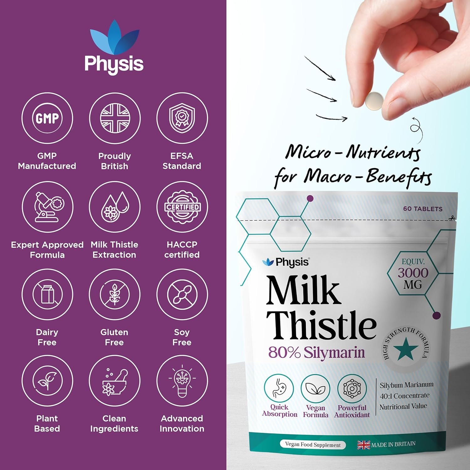 Physis Milk Thistle High Strength | 80% Silymarin | Liver Support Supplements | Milk Thistle Seeds | Vegan Food Supplement | 60 x Tablets | Made in Britain