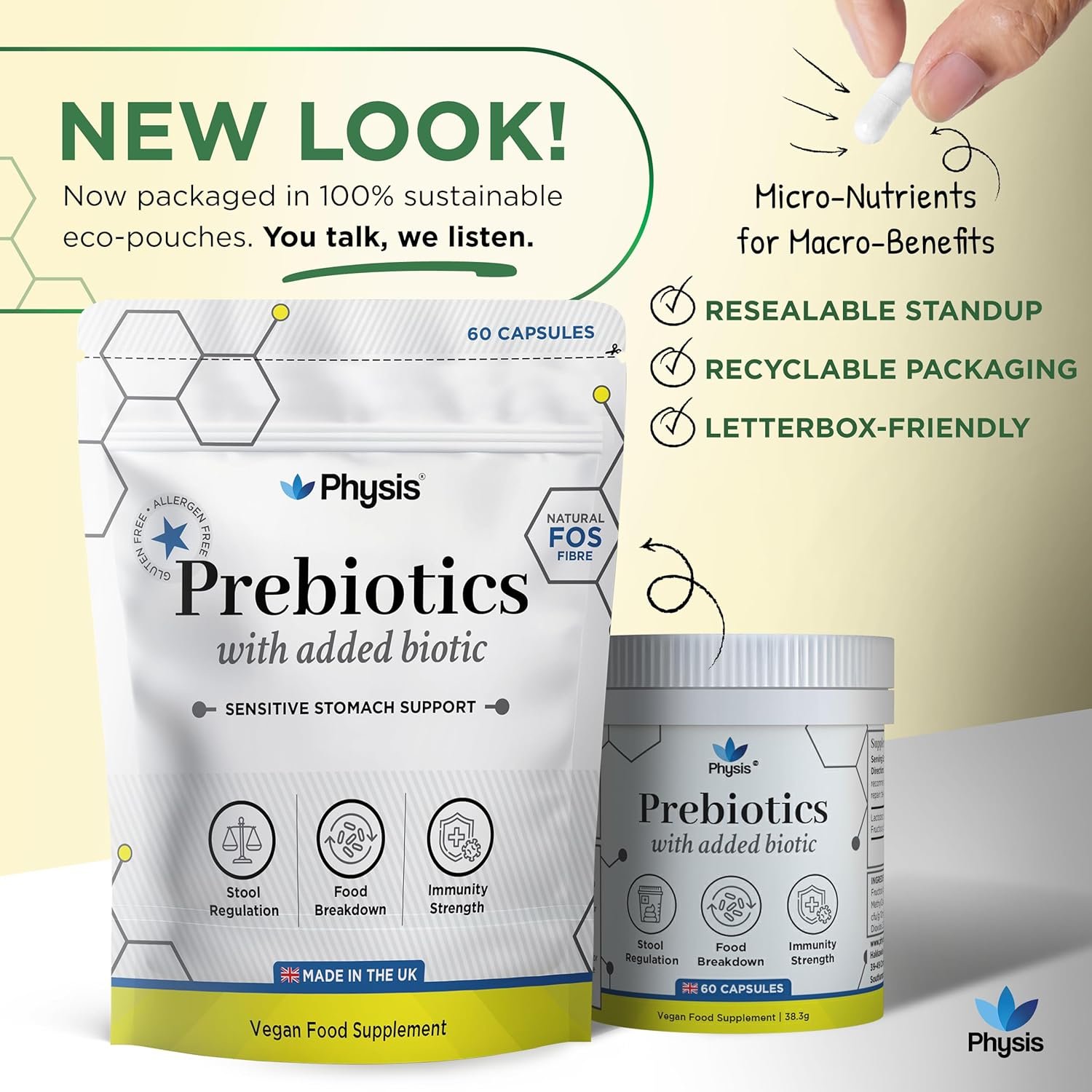PHYSIS PREBIOTICS WITH ADDED PROBIOTICS: Specially formulated to provide prebiotic fibre (Fructooligosaccharides) and probiotics (Lactobacillus Acidophilus) to promote a healthy gut microbiome. Effective biotic therapy for sensitive stomachs prone to irritation and disruption. Increases fibre intake and helps reduce bloat symtoms and aids constipation relief.