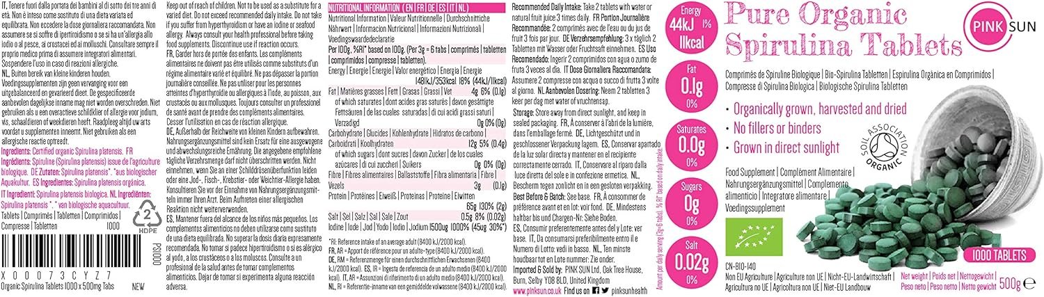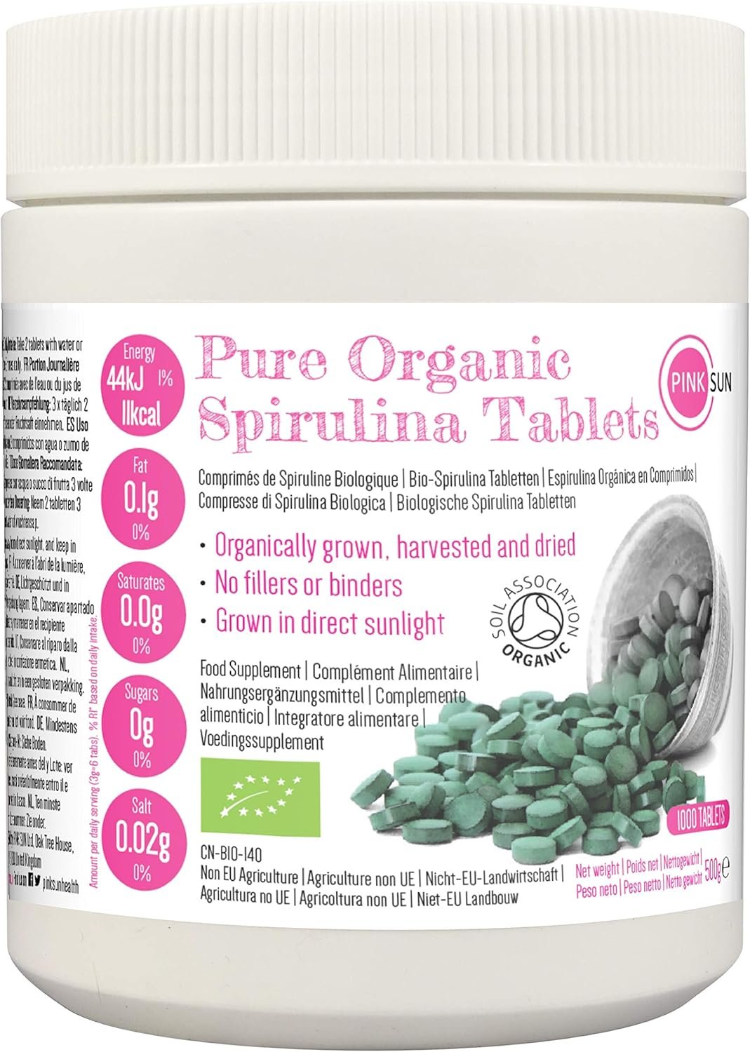 PINK SUN Organic Spirulina Tablets 1000 x 500mg Tabs Gluten Free Non GMO Suitable for Vegetarians and Vegans Certified Organic by The Soil Association 500g Bulk Buy