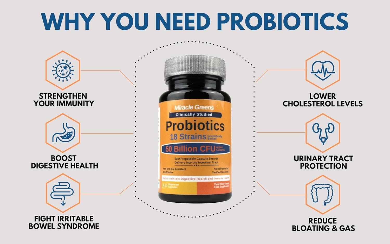 50 BILLION 18 STRAINS TARGETED RELEASE FORMULA – Miracle Greens 50 billion bacterial cultures capsules is scientifically backed, formulated with 50 Billion living organisms per Serving, featuring targeted release technology to help Probiotics survive stomach acids and reach your intestinal track.