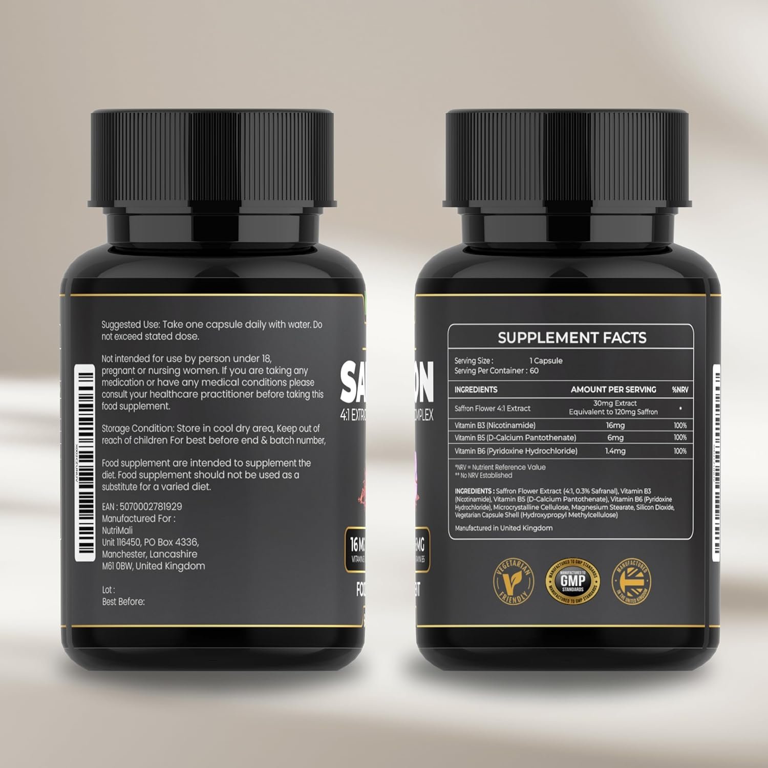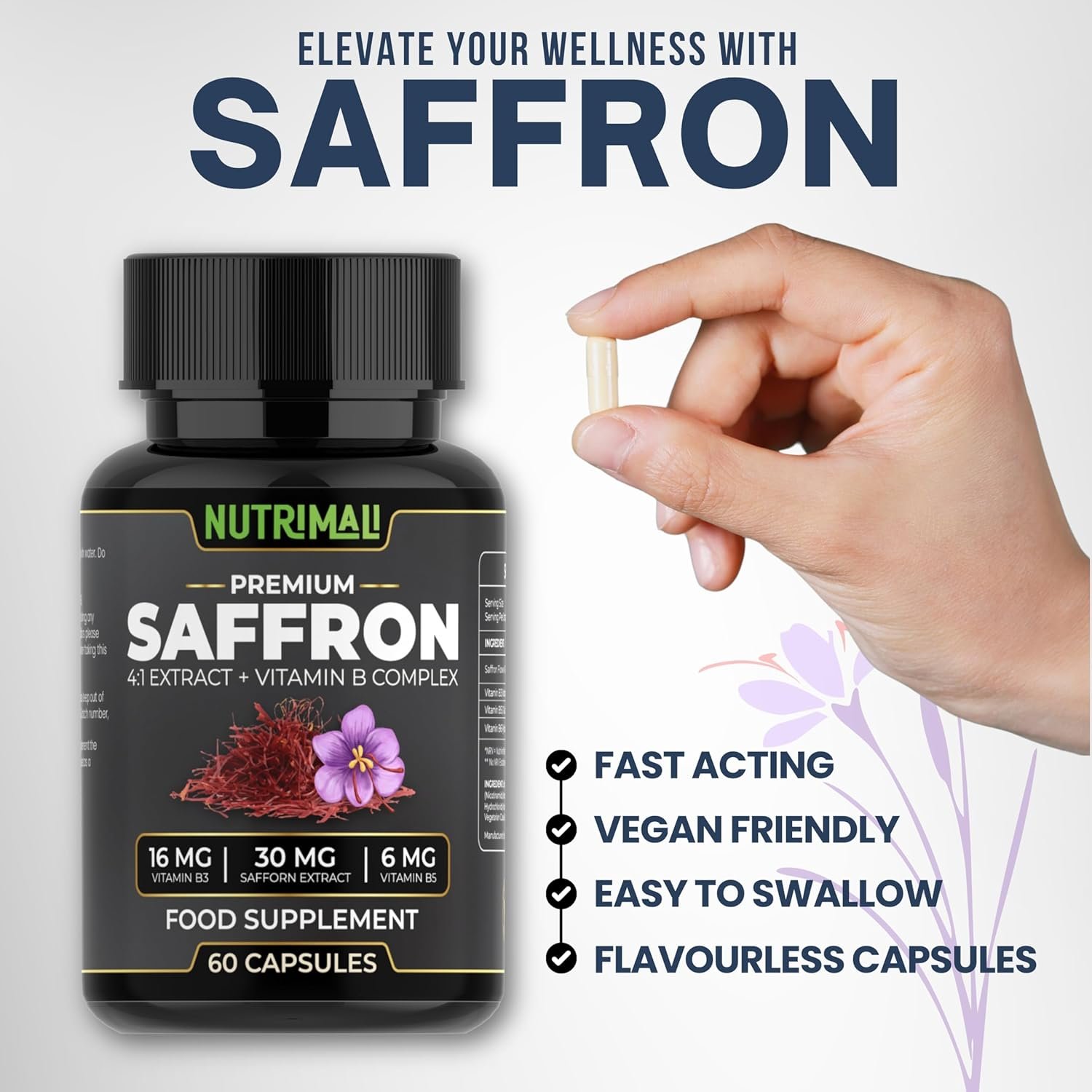 Premium Saffron Supplement – 4:1 Saffron Extract + Vitamin B Complex | High Strength – 60 Vegan Capsules | 100% Pure Saffron, Non-GMO