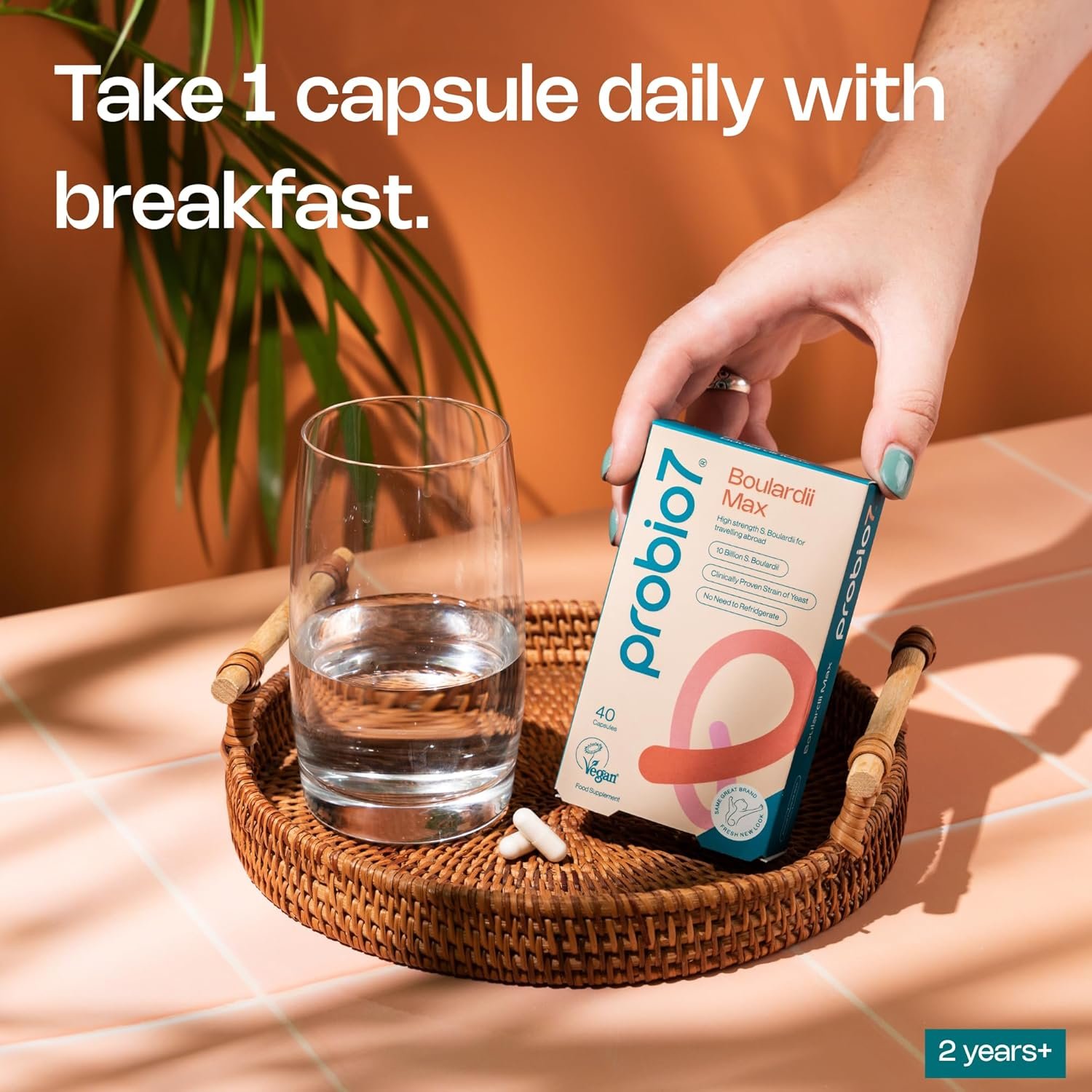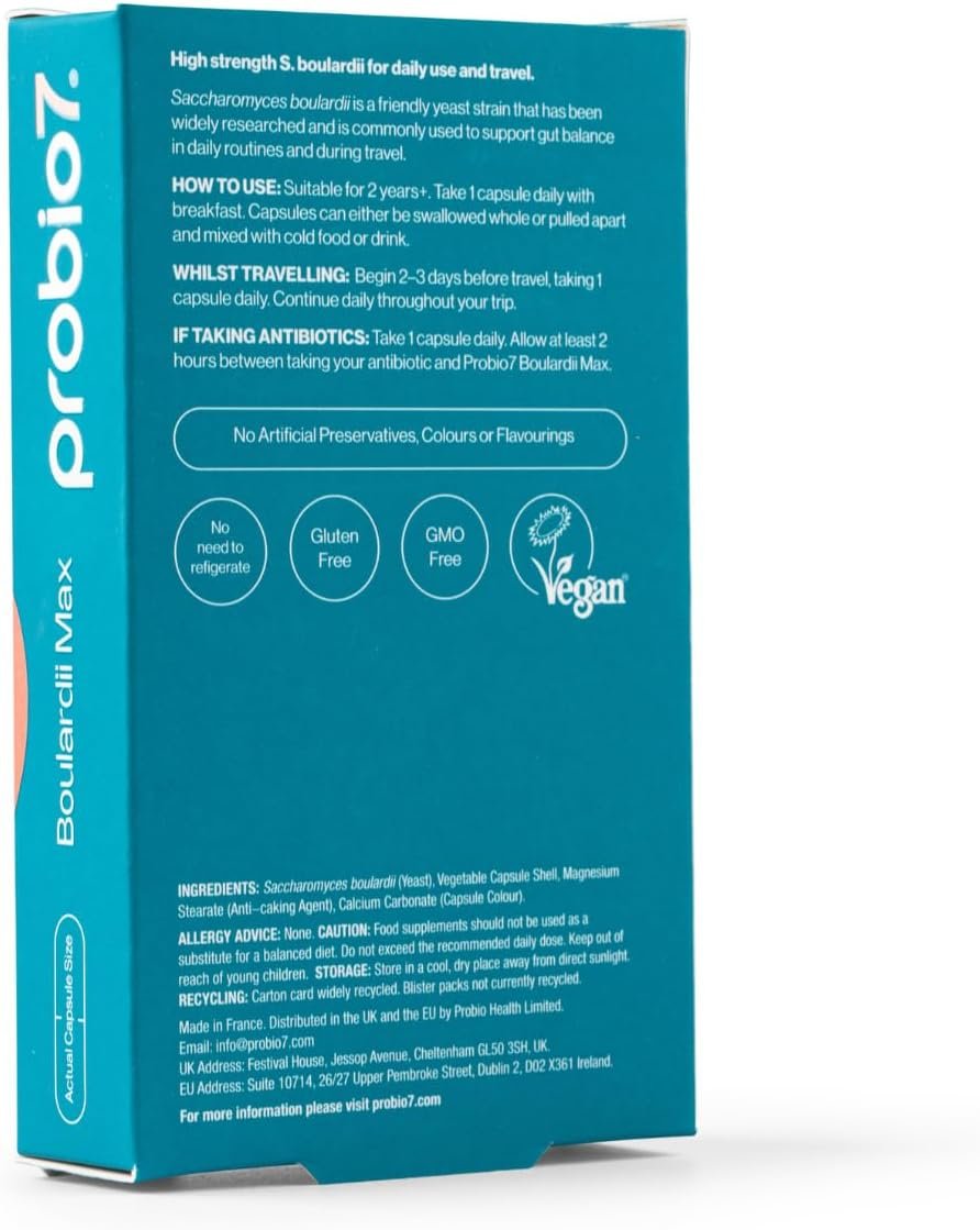 Probio7 Boulardii Max contains Saccharomyces boulardii, a unique and clinically studied strain of friendly yeast that has been safely used for over 50 years. Unlike many probiotic bacteria, it’s naturally resistant to antibiotics and proven to reach the gut alive, helping to support and restore a balanced microbiome.