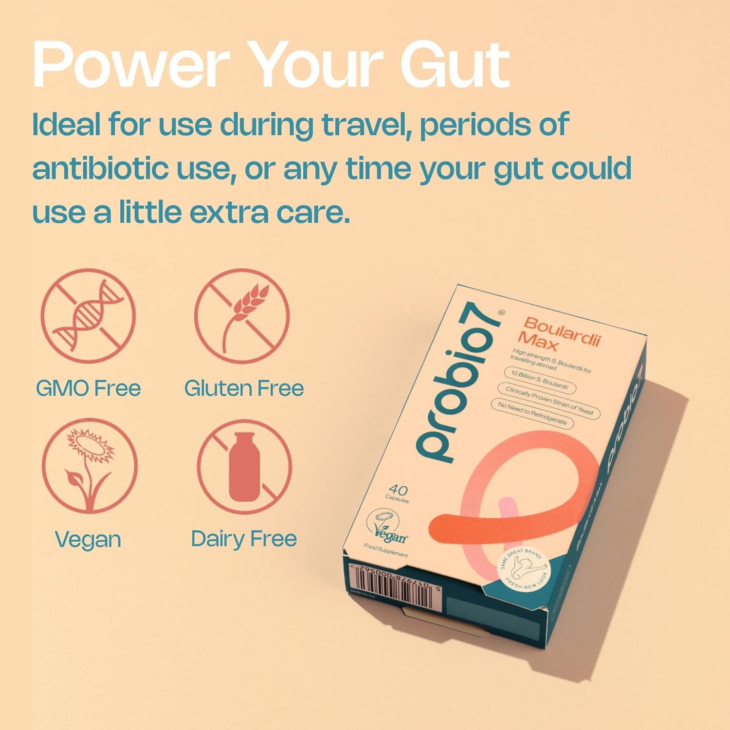 Probio7 Boulardii Max | Targeted Travel Gut Support | Saccharomyces Boulardii Supplement for Gut Repair & Digestive Health | 10 Billion CFU, Probiotics for Gut Health Support – 40 Capsules