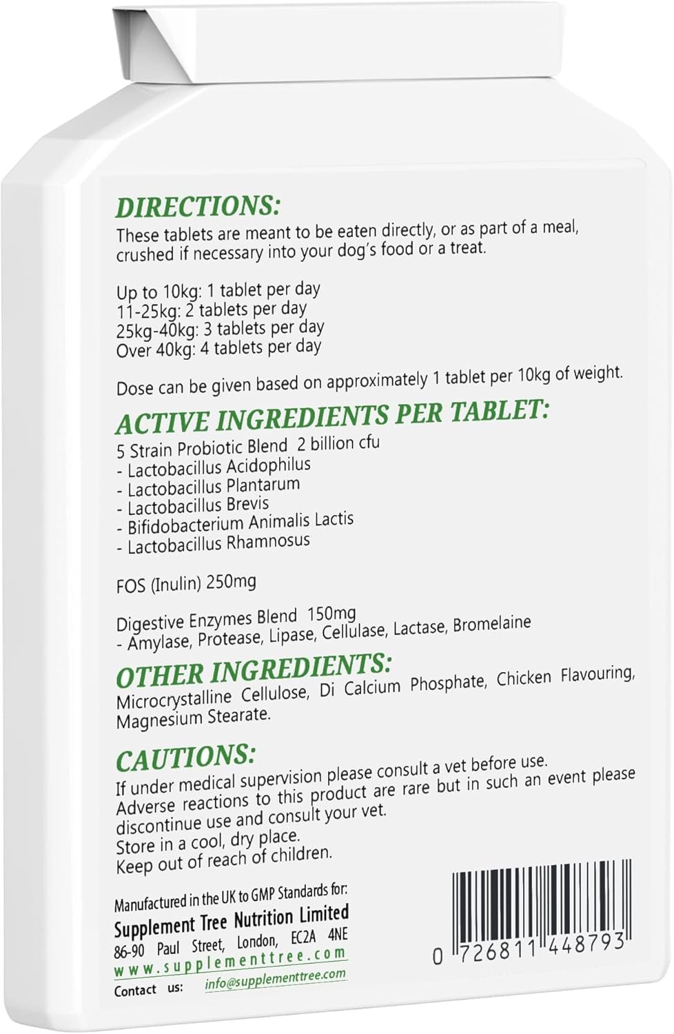 SPECIALLY FORMULATED: Probiotics Support for Dogs is a 5 strain 2 Billion CFU Probiotic Blend supplement with added digestive enzymes and prebiotics to provide the ultimate digestive and health support food supplement for pets. Our Dog Probiotics comes in yummy chewable chicken flavoured tablets for easy daily administration.