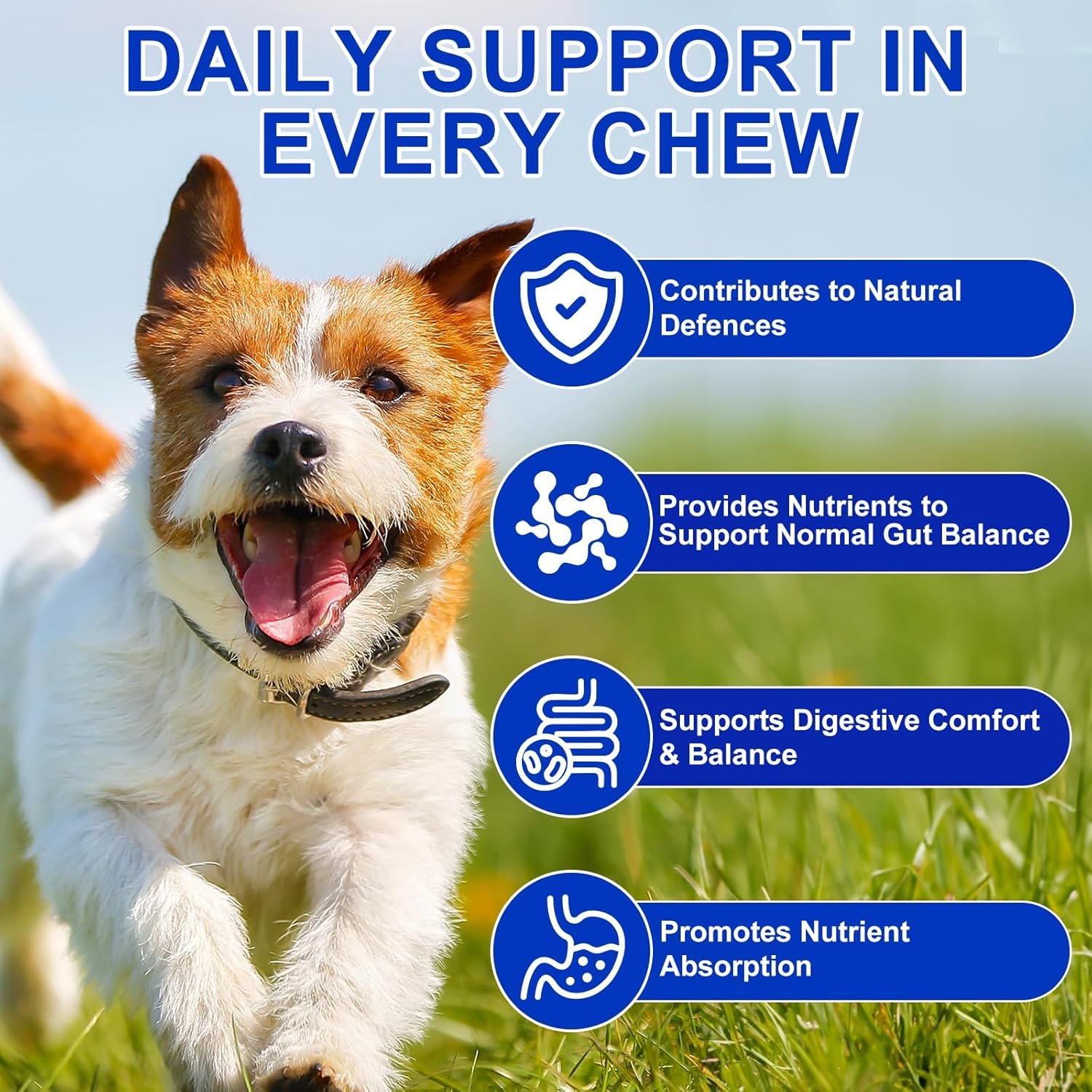 IMPROVING DIGESTIVE HEALTH: Dog Probiotics contains natural gut-friendly proprietary nutrients that aid in the production of digestive enzymes, resulting in smooth digestion, reduced bad breath and constipation relief.
