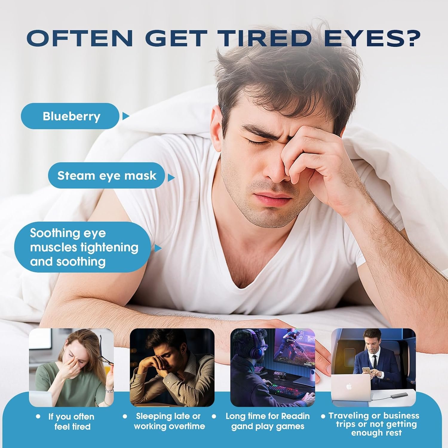 【Soothe your eyes】 Eucalyptus Fiber ease your dry and tired eyes with our steam eye masks. Just open and wear it, and heated eye mask will automatically heat up within minutes, releasing moist warm heat, delicate steam to soothe the skin around your eyes, relieving eye fatigue, dry eyes, puffiness, dark circles, styes, and sinus pressure. Our warm eye compress effectively improves eye health issues, making it an ideal choice for you if you need long-term eye care.