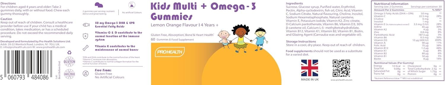 ProHealth Kids Multivitamin & Mineral + Omega-3 Gummies – 18 Essential Nutrients – Natural Lemon & Orange Flavour – Age 4+ – Gluten-Free, Non-GMO – Immune & Brain Support – 60 Gummies (30-Day Supply)