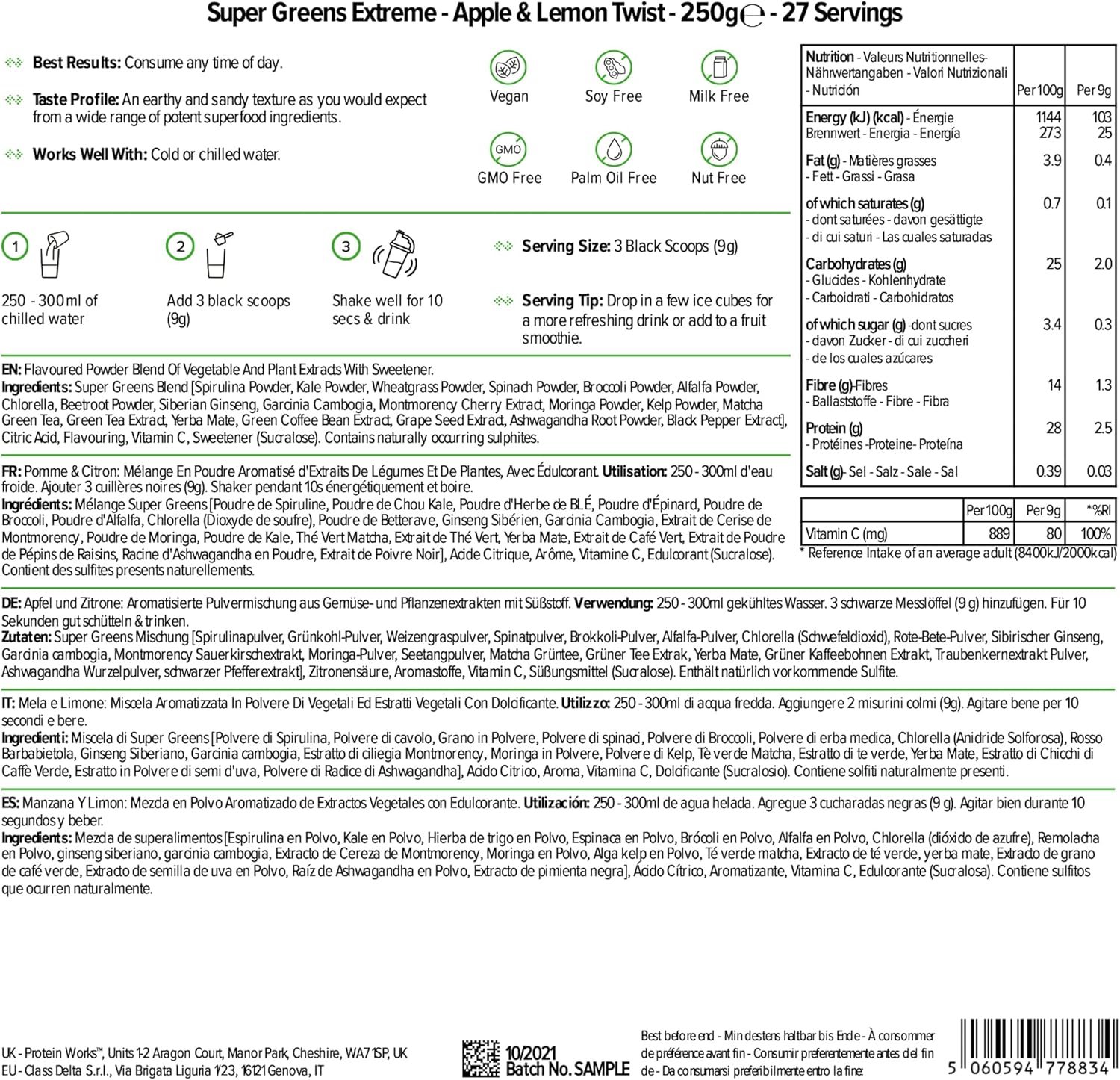 Protein Works – Super Greens Extreme, 150+ Health Benefits, Apple & Lemon Twist, Vegan, 41 Active Ingredients, No Added Sugar, 20 Servings, 250g