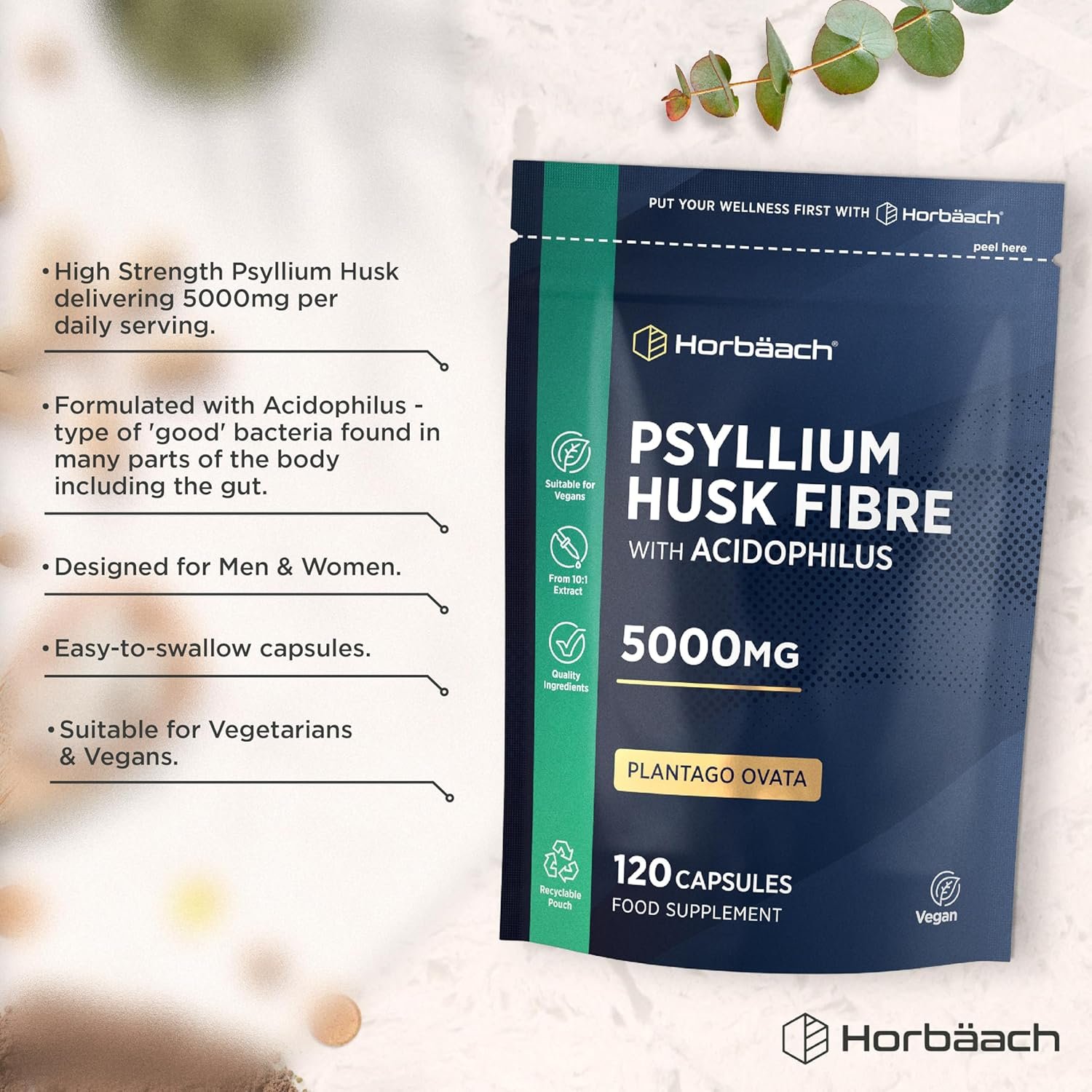 Psyllium Husk Capsules 5000mg with Acidophilus | Natural Soluble Fibre Supplement with ProBio | Plantago Ovata Seed Husk Extract | 120 Vegan Capsules | by Horbaach
