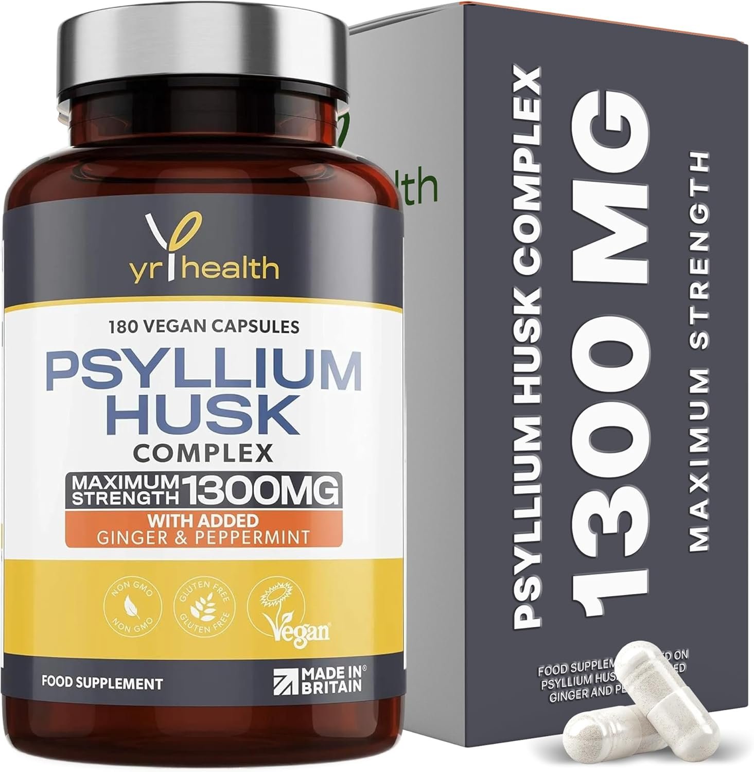 Psyllium Husks Capsules – 1300mg Fibre Supplement – 180 Vegan Capsules with Added Peppermint & Ginger – 2 Capsules not Tablets Per Serving – Plantago Ovata Plant Seeds – Made in The UK by YrHealth