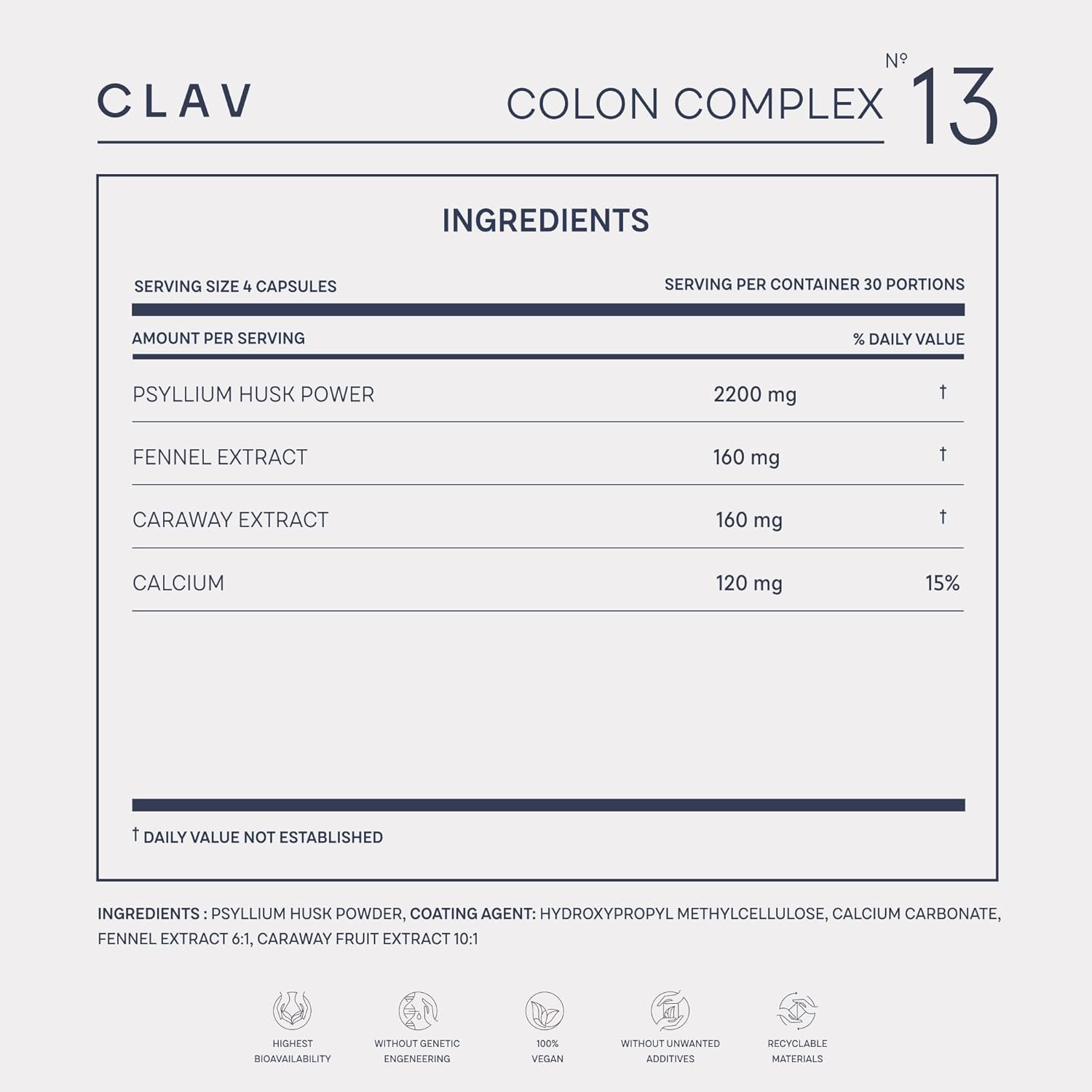SYNERGISTIC BLEND FOR OPTIMAL DIGESTIVE SUPPORT – The combination of caraway and fennel extracts with psyllium husk fiber in our N°13 Colon Complex offers a more comfortable digestion experience. This blend helps support the well-functioning of the digestive system and assists in alleviating digestive discomfort, setting a new standard in fibre supplements.