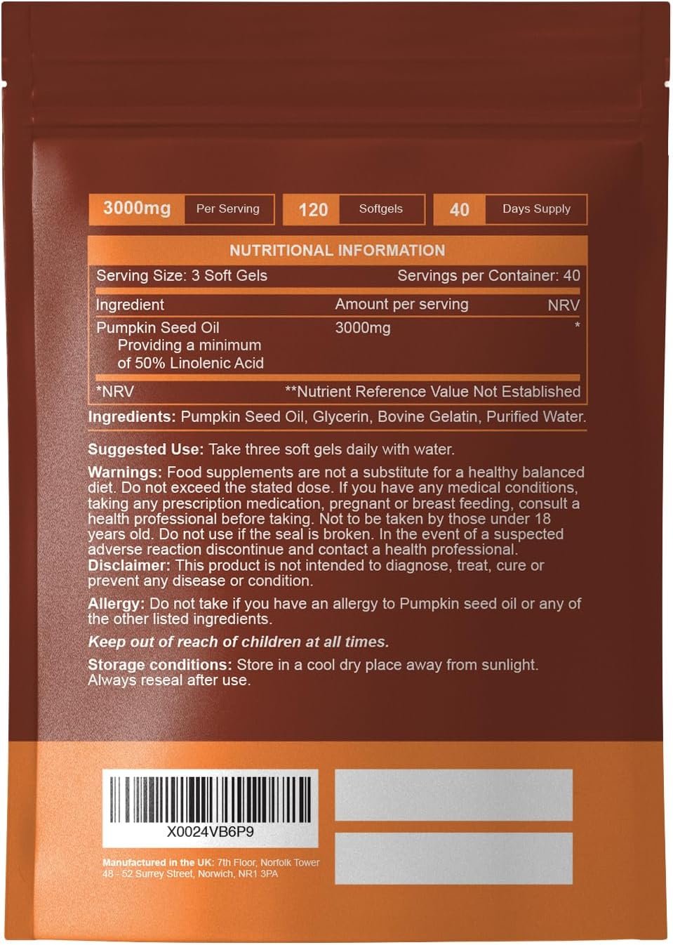 Pumpkin Seed Oil Capsules 1000mg (3000mg per 3 Soft Gel Serving) | 120 Capsules | Cold Pressed | Pumpkin Seed Oil for Hair, Prostate and Bladder | UK Made
