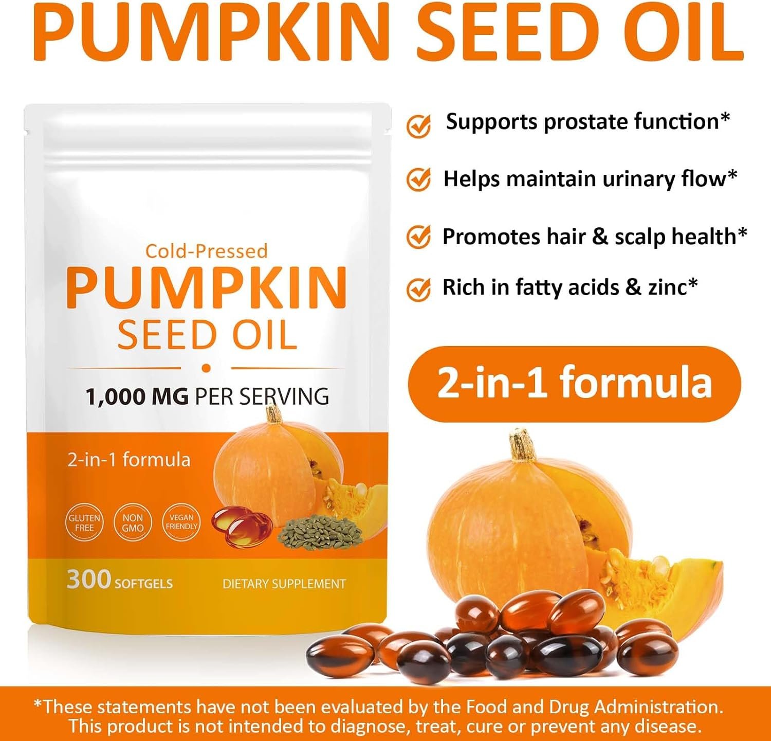 🎃【Premium Pumpkin Seed Oil Capsules】Our pumpkin seed oil capsules use cold-pressed extraction to retain natural nutrients. The 2-in-1 composite formula is scientifically formulated for synergistic effects, providing comprehensive health support and dual health benefits for both men and women.