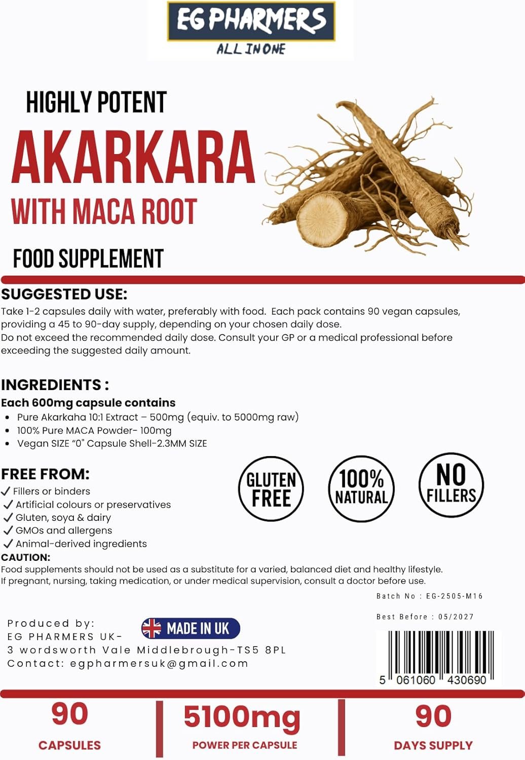 Pure Akarkara with Maca Root Capsules – 90 Vegan Capsules (90-Day Supply) | High Strength Herbal Supplement for Energy, Stamina & Vitality | Gluten-Free, No Fillers, UK Made & Lab Tested