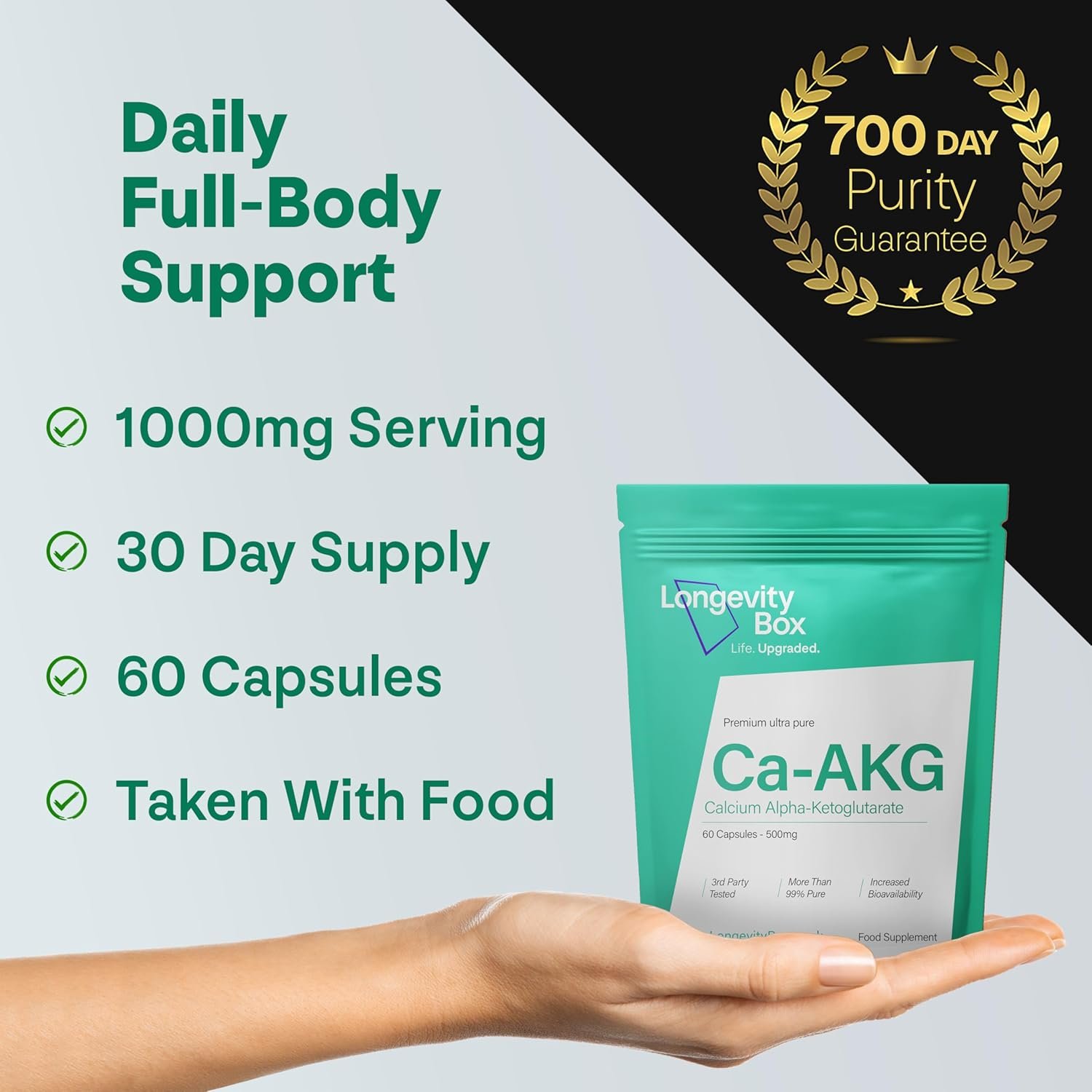Ultra Pure Formula – Each serving delivers 500 mg of calcium alpha-ketoglutarate in its purest form, carefully formulated without fillers, additives, or artificial ingredients.