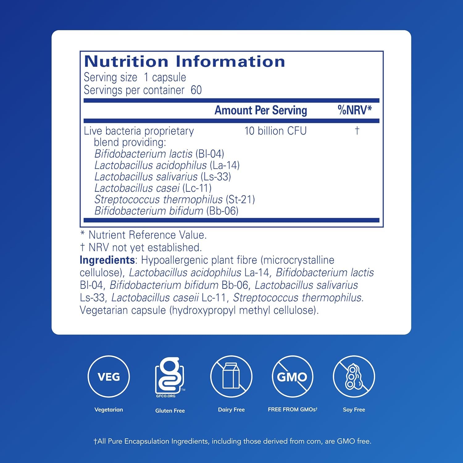 Active Ingredients: Multi-strain blend of Lactobacillus, Bifidobacterium and Streptococcus that assists with broad-spectrum support