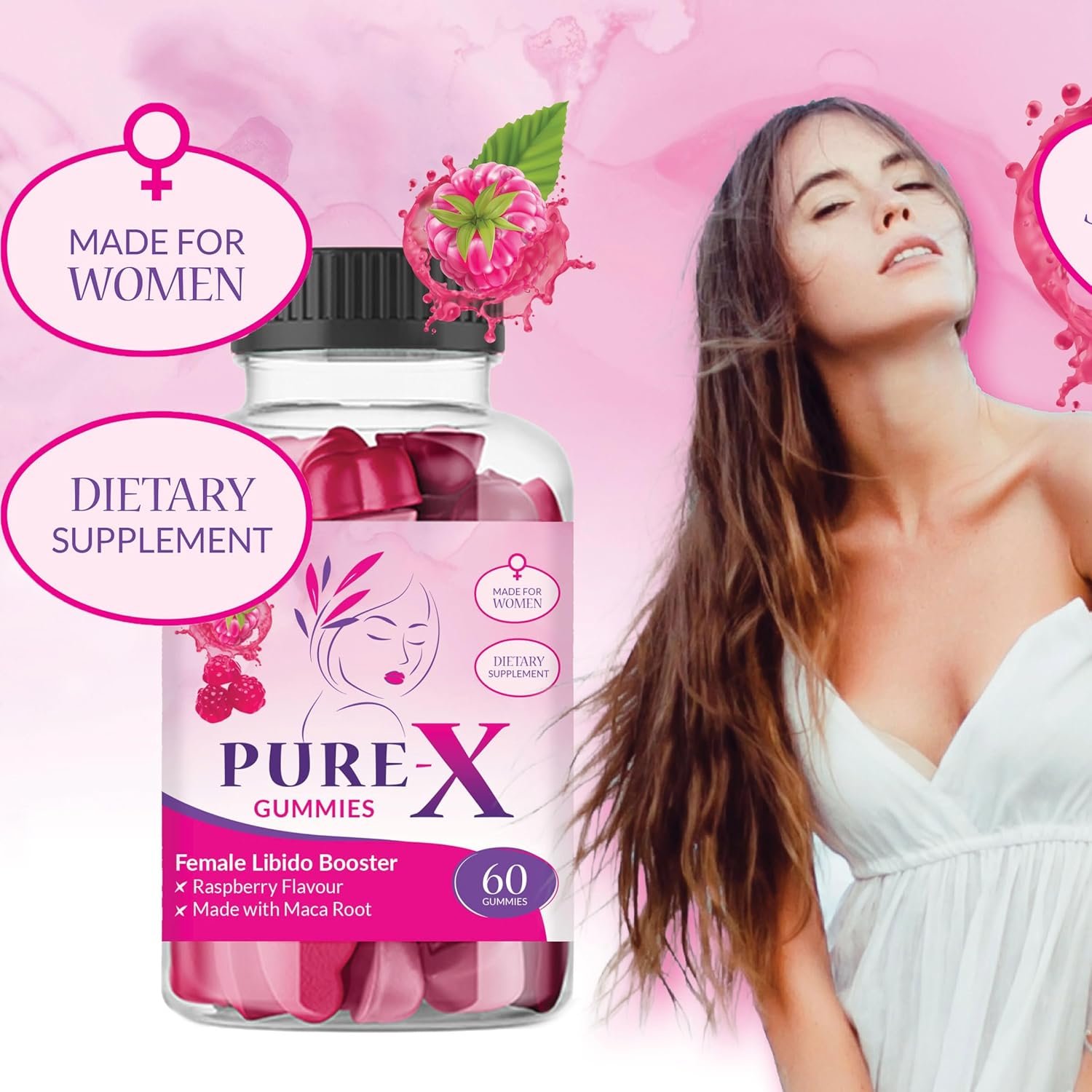 Pure-X raspberry-flavored gummy supplements in pink bottle, featuring splashing liquid graphics and maca root ingredient callout on packaging.Pure-X raspberry-flavored gummy supplements in pink bottle, featuring splashing liquid graphics and maca root ingredient callout on packaging.