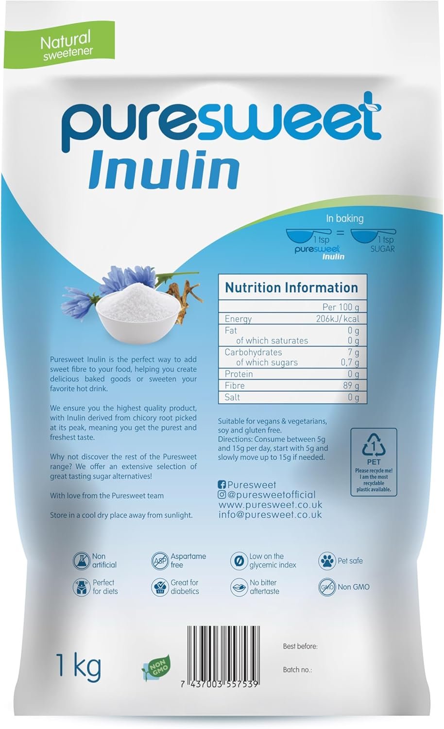 Puresweet Premium Inulin Prebiotic Fibre Powder 1Kg Chicory Root, Non Gmo, Highly Soluble, Made In The Eu, Fructo Oligosaccharide Fos , Gluten Free, Vegan.